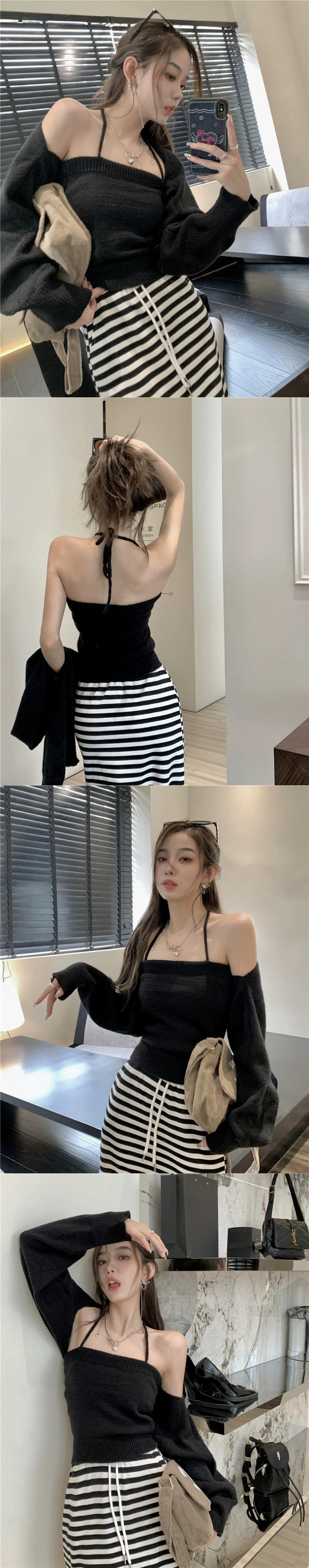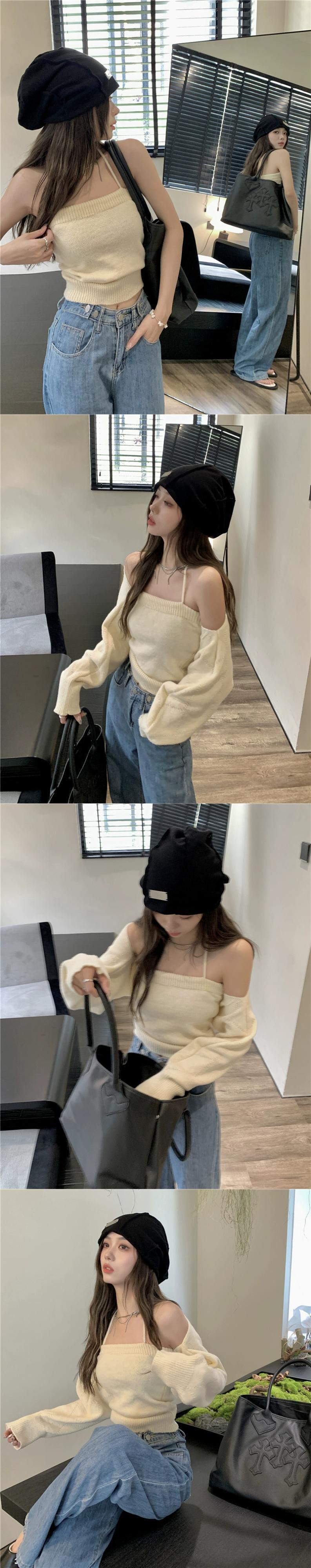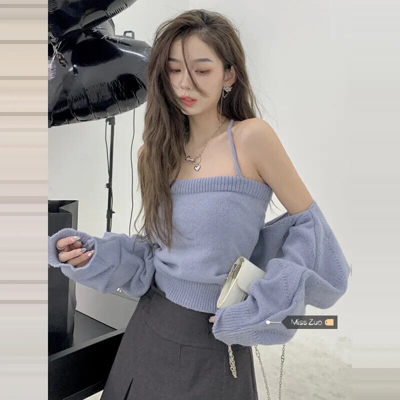 ショートニットカーディガンジャケットレディース秋デザインニッチサスペンダーアウターショールレイヤードブラウス2点セット レッド オータム 秋物 8571697339218101