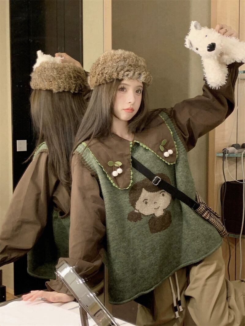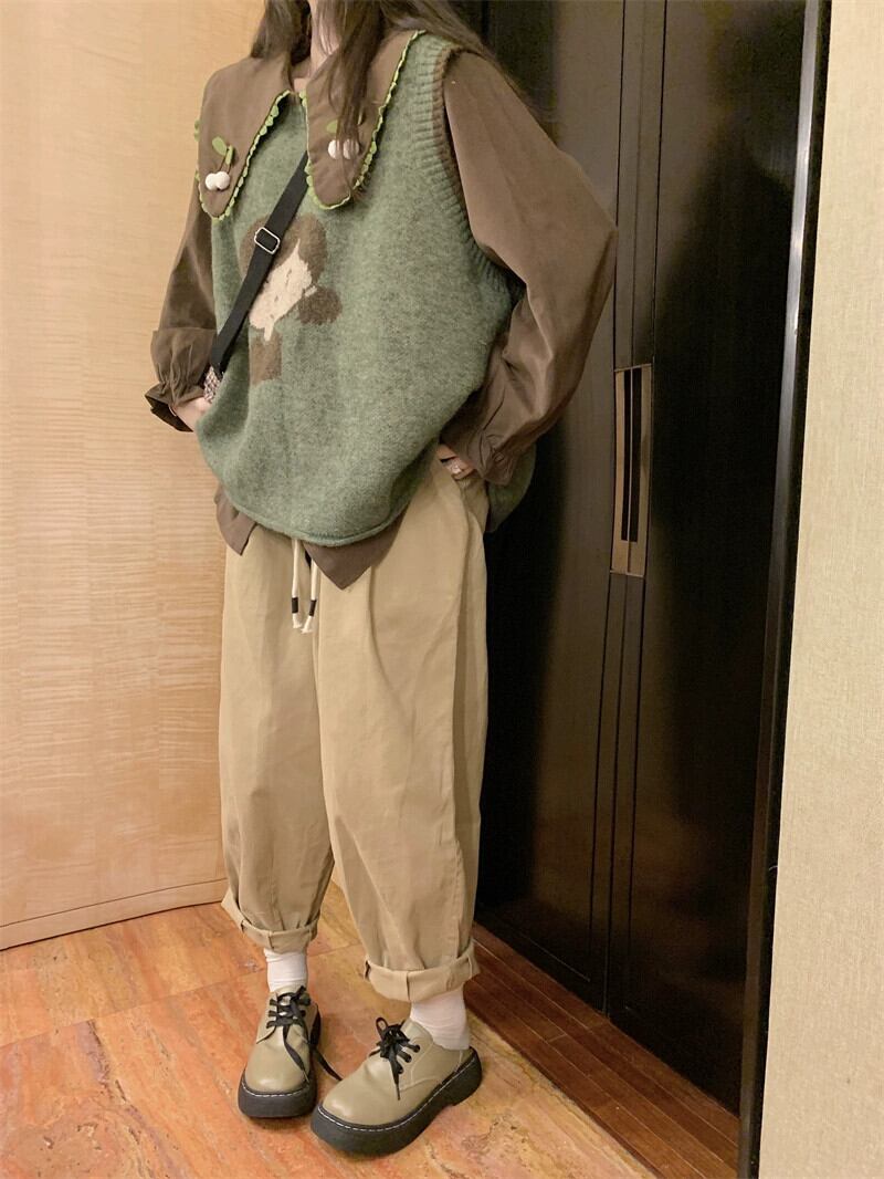 色:コーヒーシャツ,人形ベスト,ライトカーキパンツ