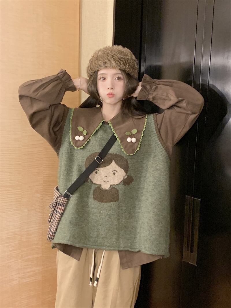 秋のニットベスト付きシャツ、レイヤードセーターベスト、フレンチレトロチョッキ、高級ベスト レッド 8571654379703911