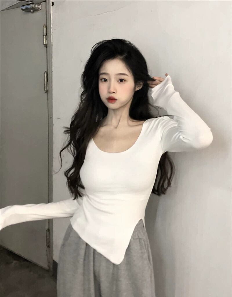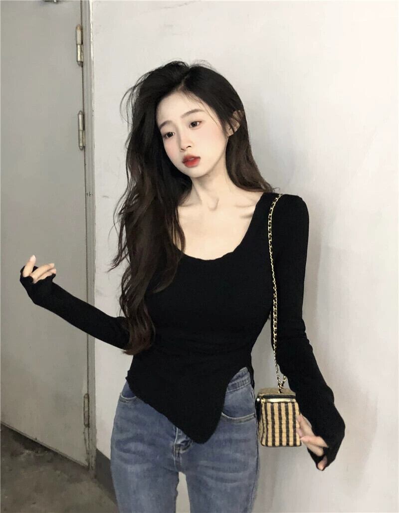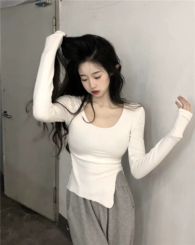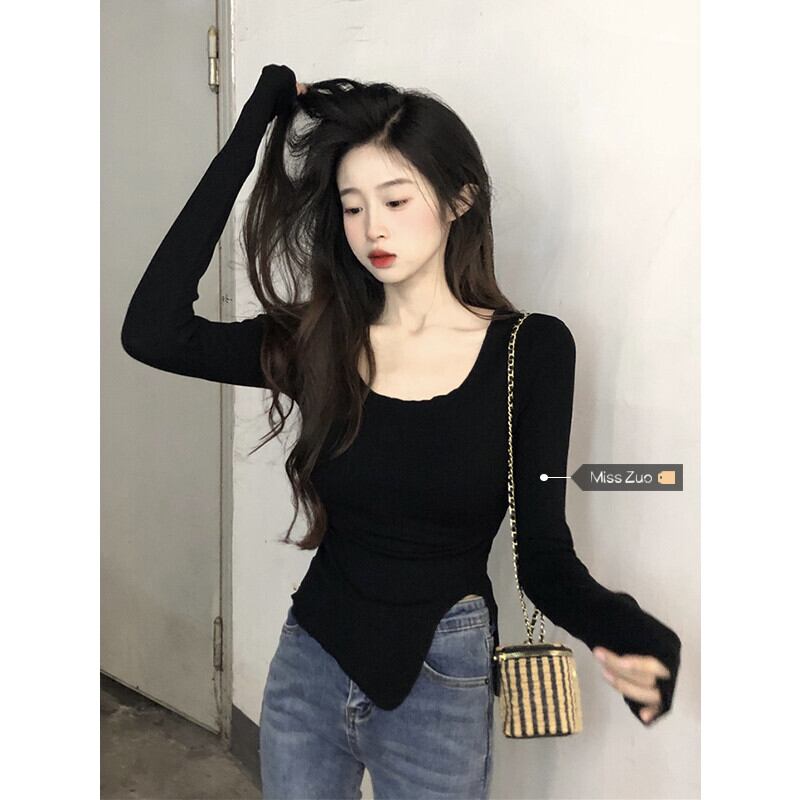 黒の T シャツの女性の秋の長袖タイトフィットボトリングシャツ 2023 新しい不規則なスリットショートトップ ロング ブラック オータム 秋物 Tシャツ 8571671936136932
