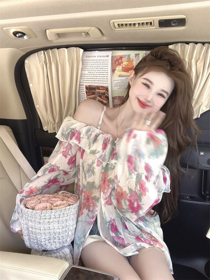 ワンショルダー花柄トップ女性の夏の新しいフレンチスタイルのシックで美しいスーパーフェアリーロータスリーフエッジ長袖日焼け止めシャツ ロング サマー 夏物 857163572911546