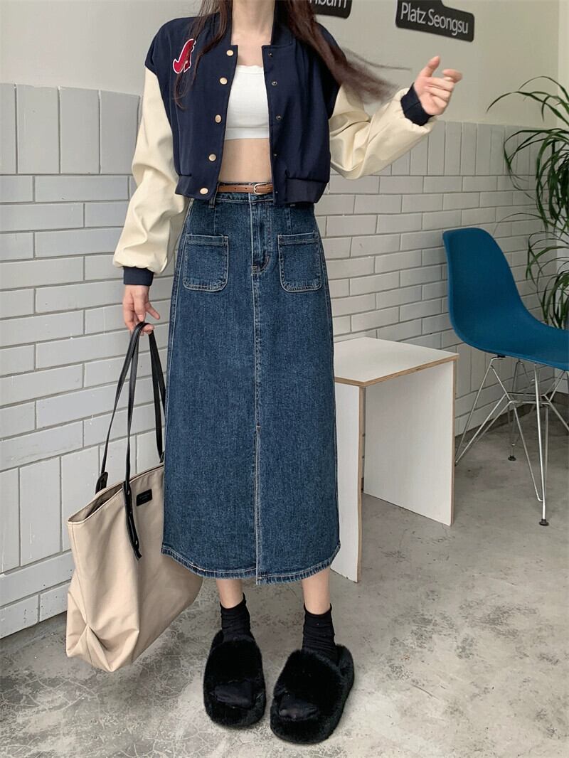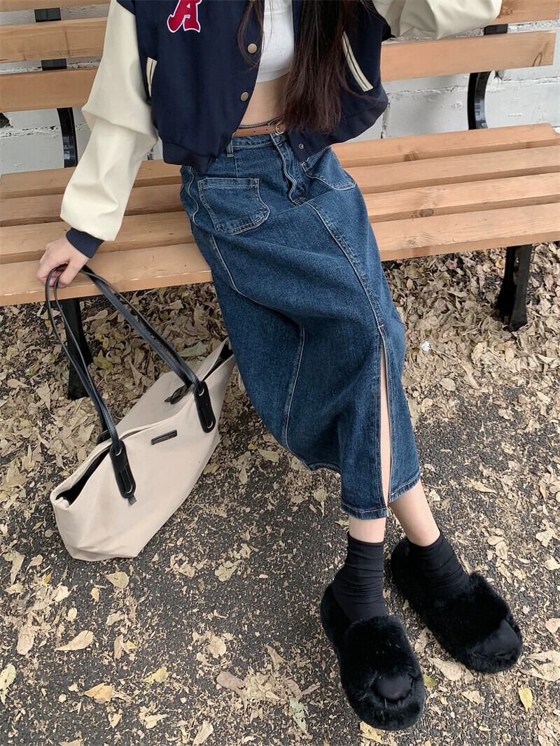 スリットデニムスカート女性秋ハイウエストミッドレングスAラインスカート2023新しいロングスカート小さい オータム 秋物 8571642826478953