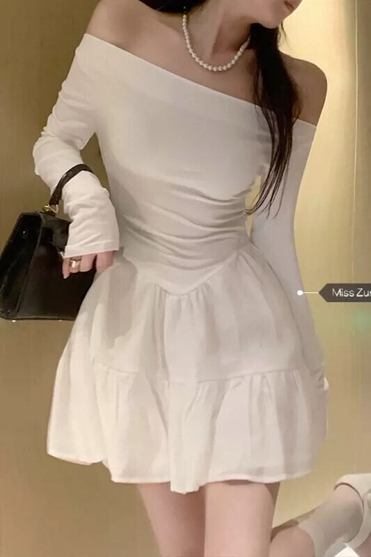 秋のワンショルダーの白いドレスの女性、ニッチなデザイン、純粋な欲望、オフショルダーとウエストの短いスカート ショート ホワイト オータム 秋物 ピュア 8571631303534335