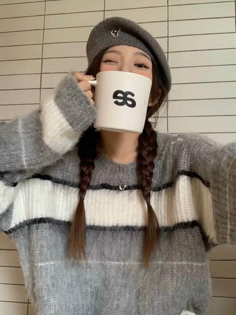 ストライプショートモヘアセーター女性 ese スタイル怠惰なレトロ秋 2023 新しいハイエンドニットセータートップ オータム 秋物 857161906742118