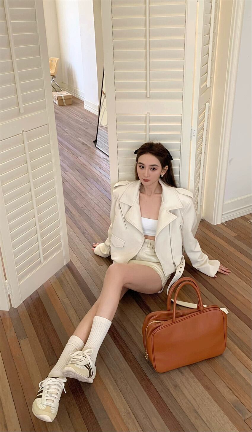 色:アプリコットレザージャケット,黒い革,アプリコットスカート,黒スカート