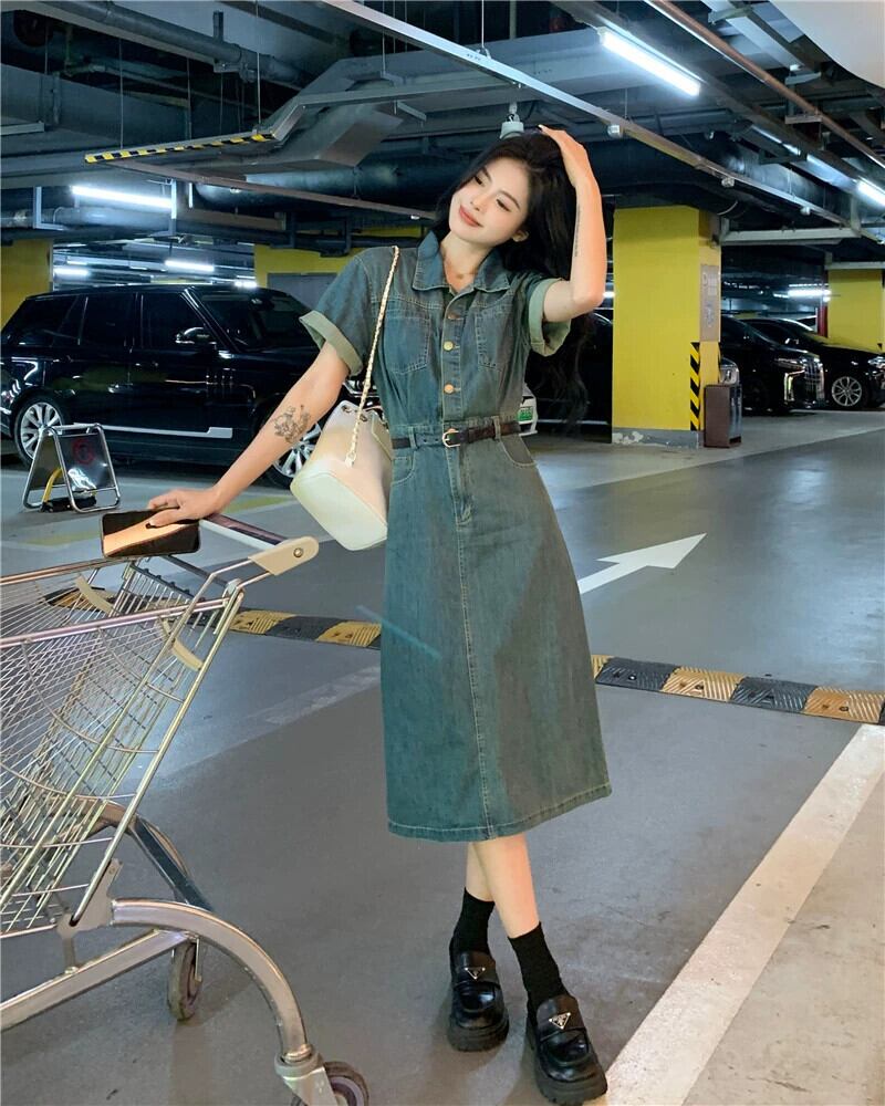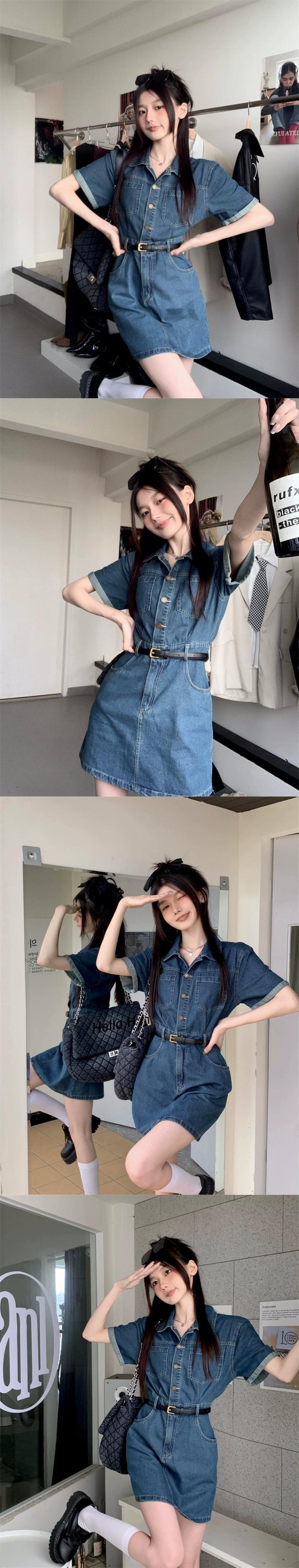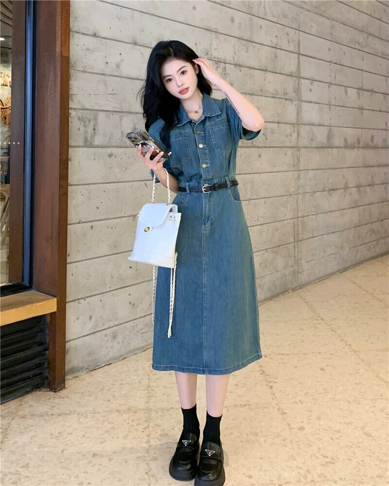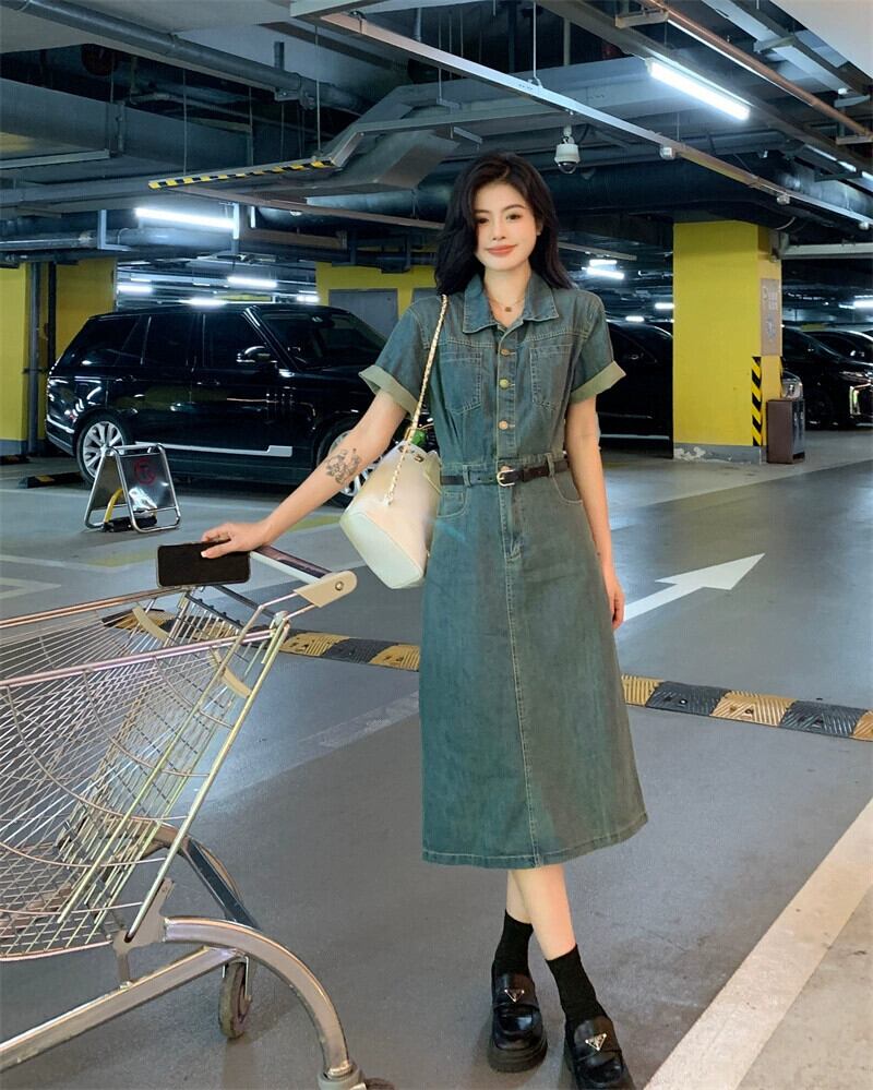 ベルト付きデニムドレスの女性の夏 2023 新デザインニッチウエスト痩身ロングスカート小人 サマー 夏物 ハーネス 857168105299577