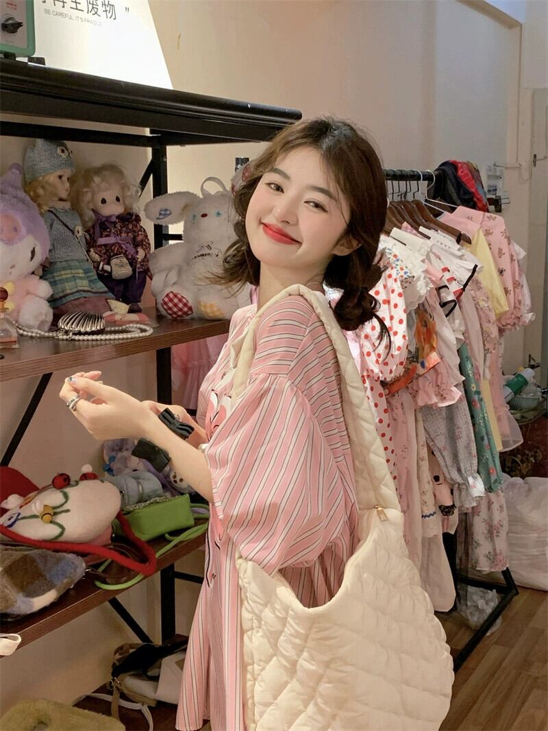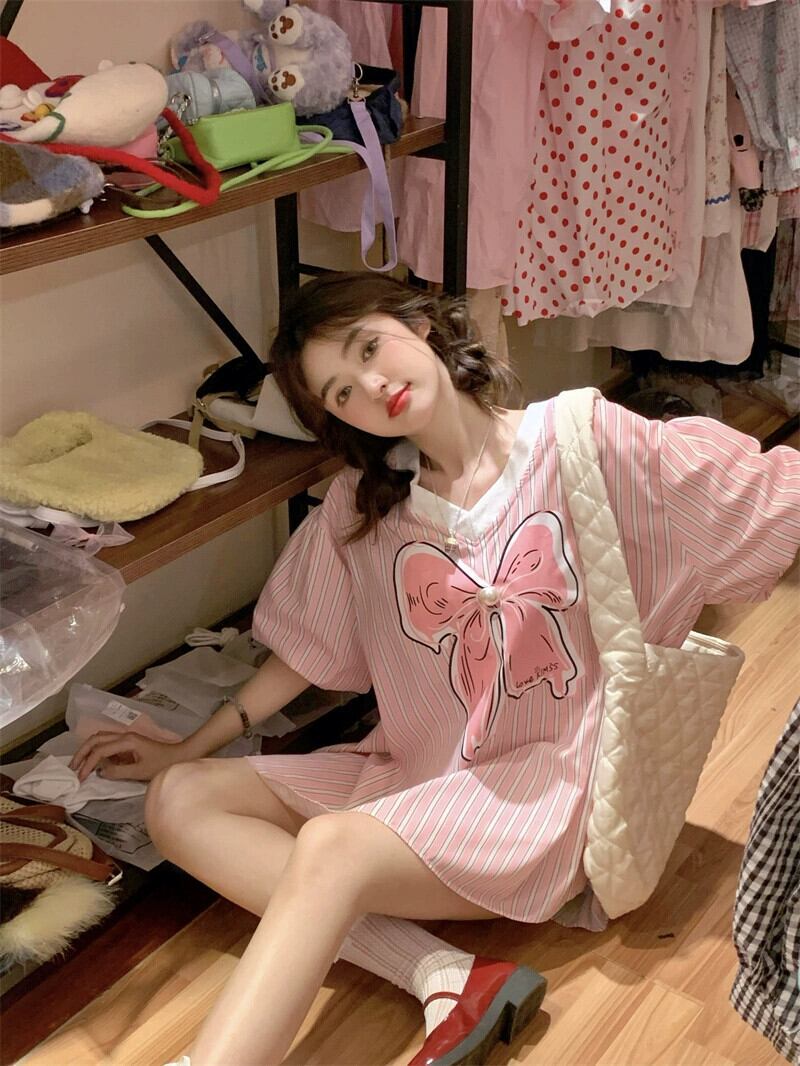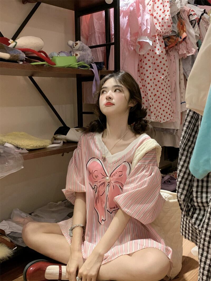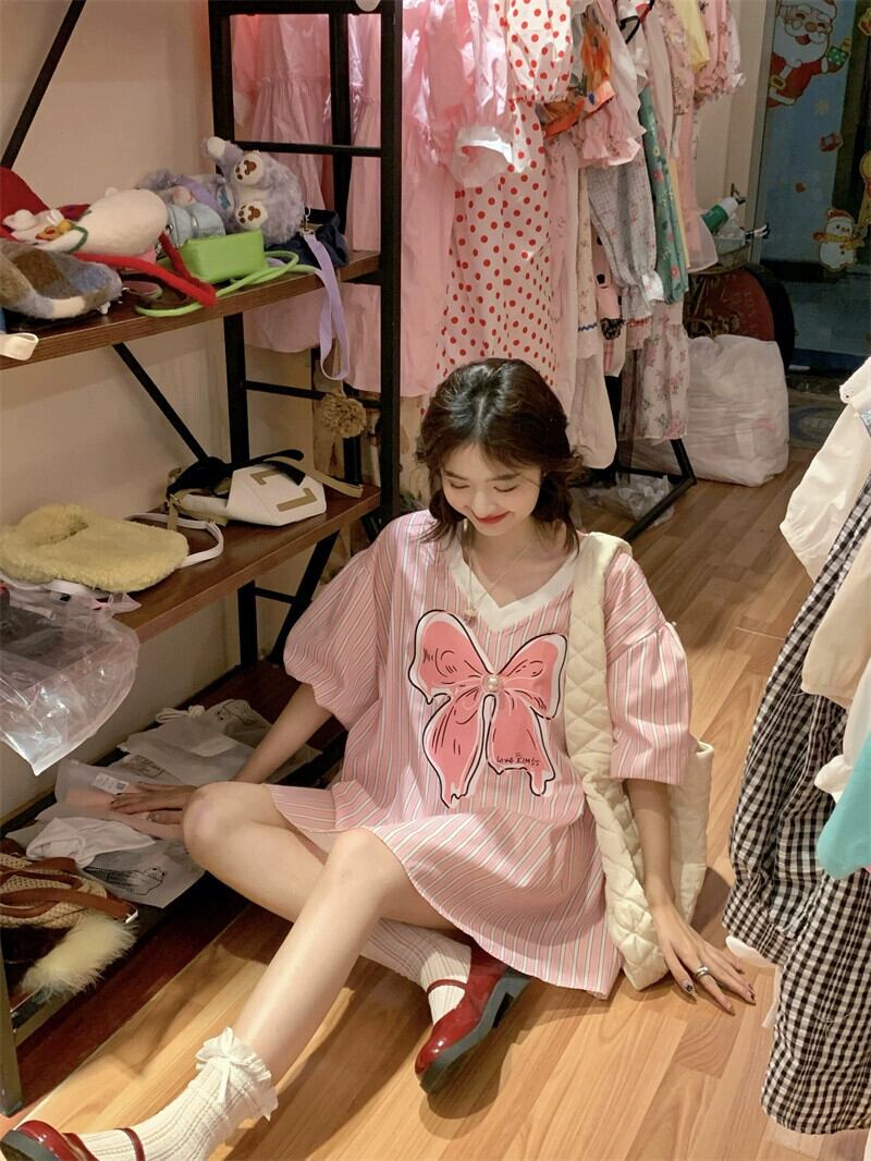 夏用のリボンプリント V ネック トップ、甘くて年齢を軽減するルーズな肉をカバーするミッドレングスのパフスリーブ ストライプ シャツ 大人ガーリー スウィート キュート カジュアル サマー 夏物 Vネック 8571623048941091