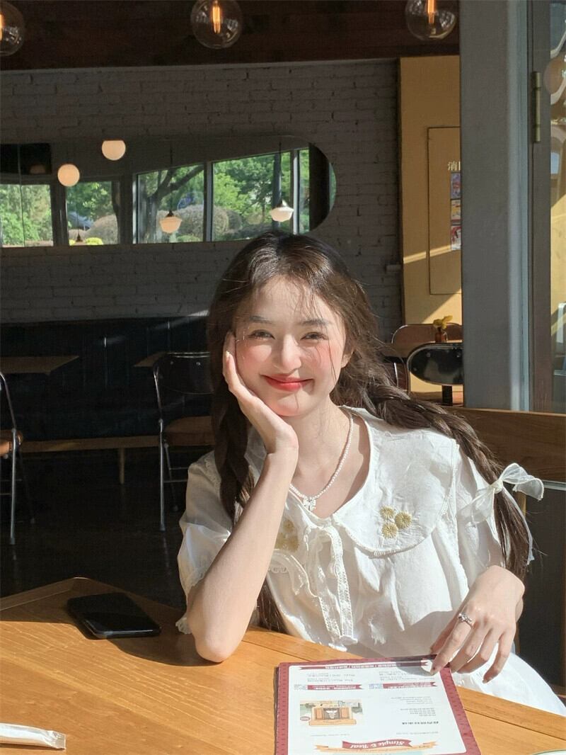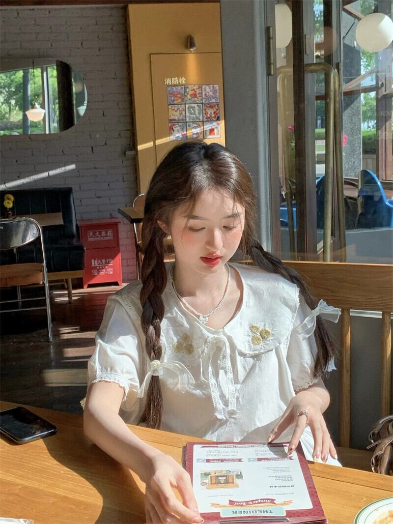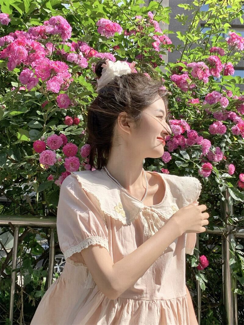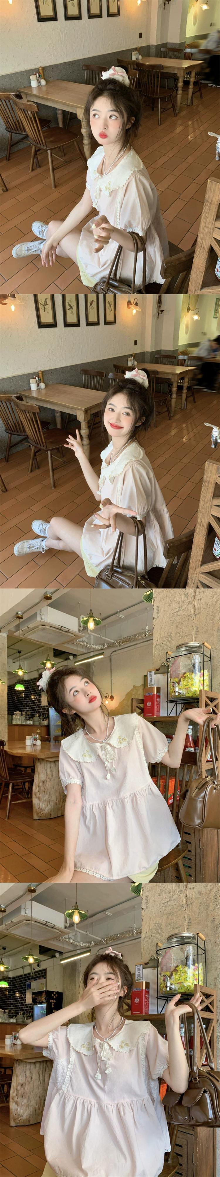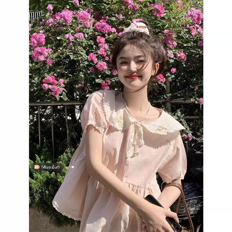 重工業刺繍ドールカラートップ女性の夏 2023 かわいい甘い年齢を減らすピンクパフスリーブシャツ 大人ガーリー スウィート キュート カジュアル サマー 夏物 8571615036699588