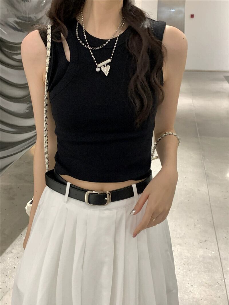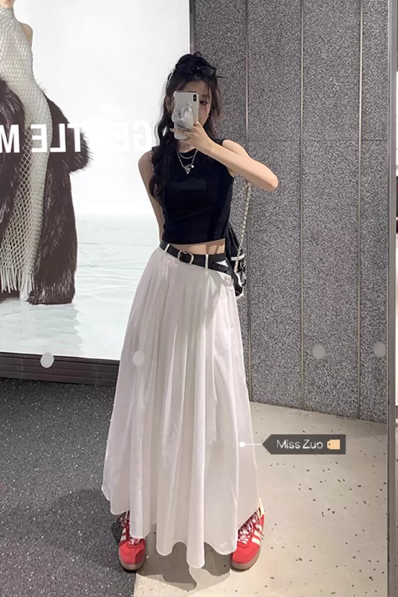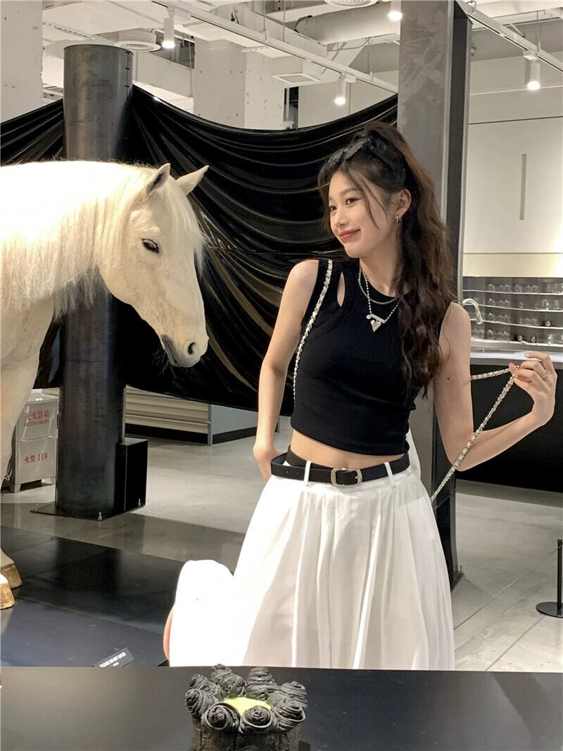 色:カットアウトブラックベスト,ベルト付き白アンブレラスカート