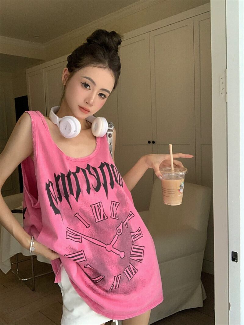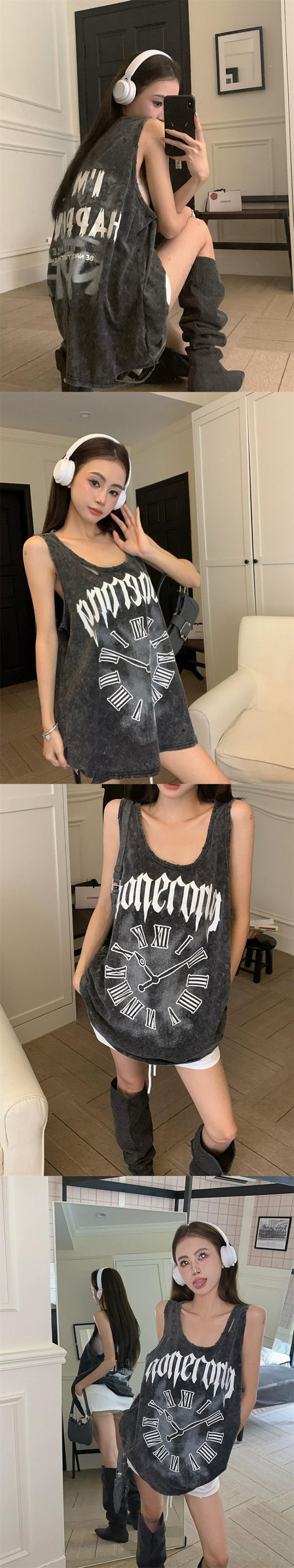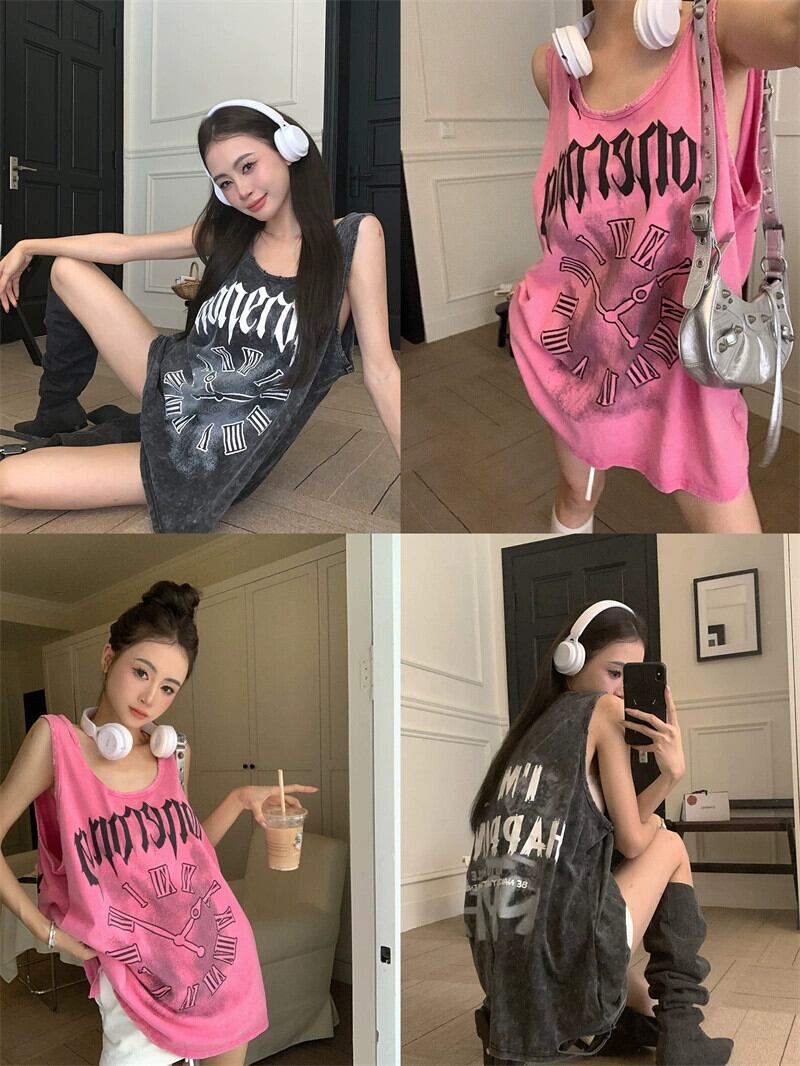 穴プリントノースリーブ Tシャツベスト女性夏アメリカンレトロダメージ加工ウォッシュブラックミッドレングストレンディトップ サマー 夏物 8571676852585277