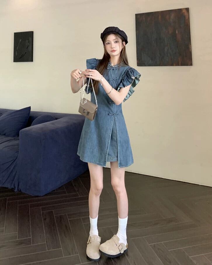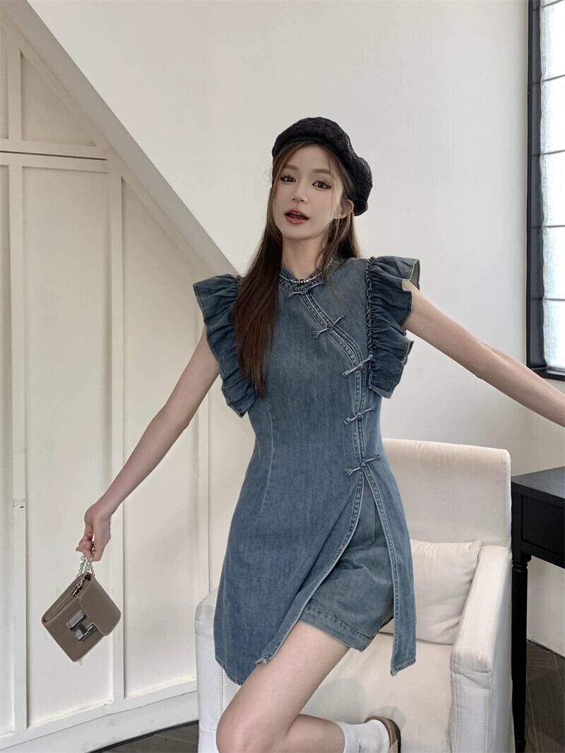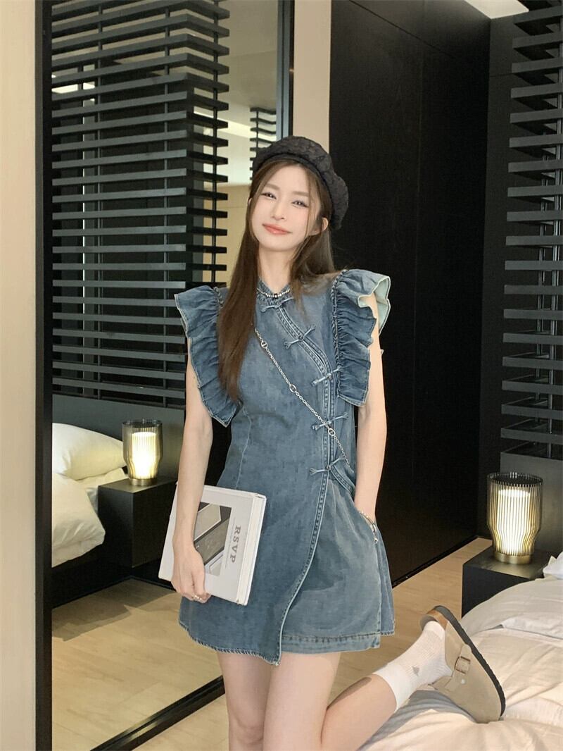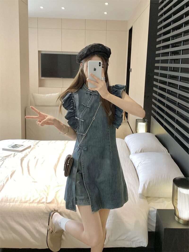 中国風中国風ディスクボタンドレス女性の夏のデザインショートスカート飛行袖とウエスト痩身小人 サマー 夏物 8571654789484047