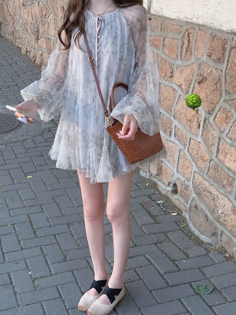 インクプリントメッシュドレスの女性の夏 2023 新しいスタイル優しくて美しい小さなスーパー妖精長袖ショートスカート ロング サマー 夏物 8571628702079040