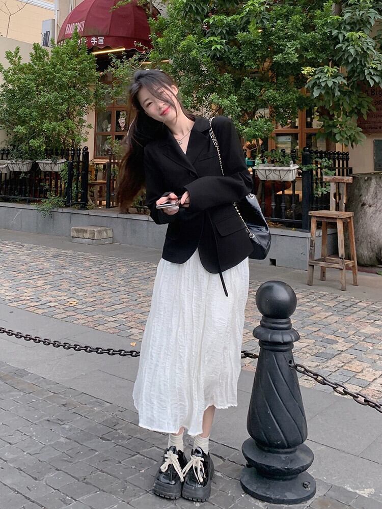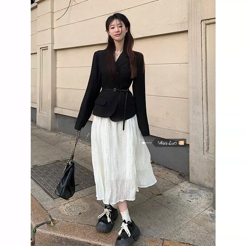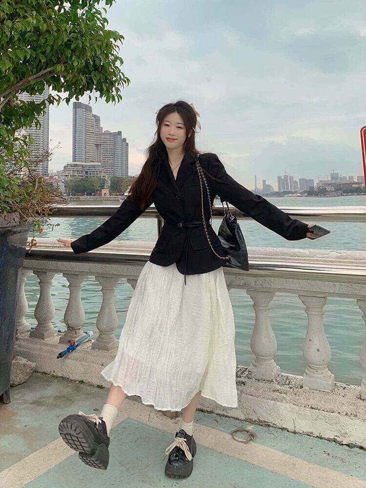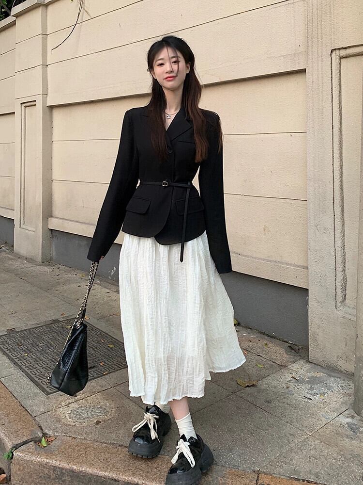 色:ベルト付きブラックトップ,白いスカート,黒スカート