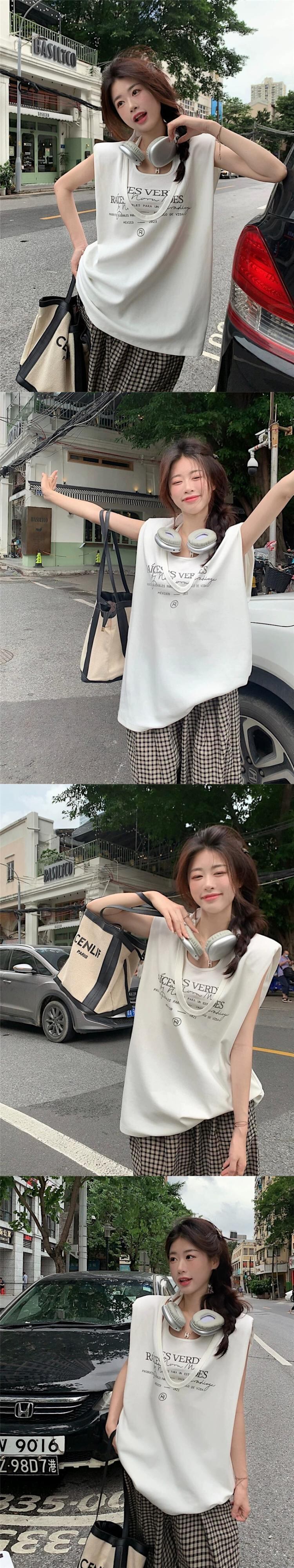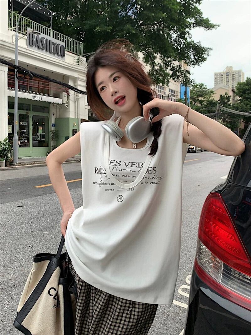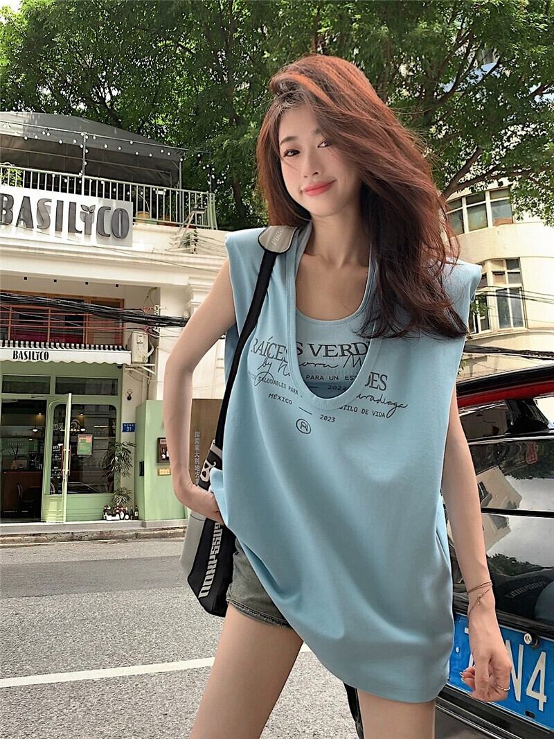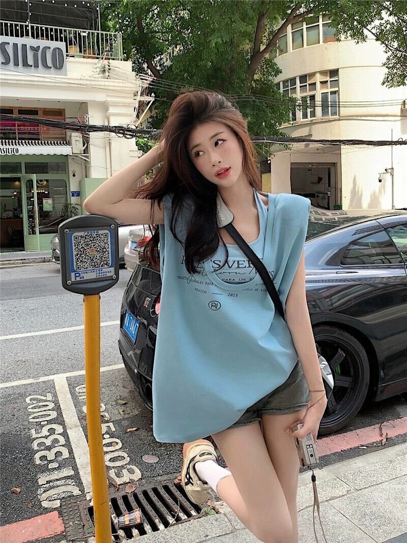 ブルーノースリーブ Tシャツベスト女性の夏の新しいアメリカンレトロネクタイミッドレングススタックトップツーピーススーツ サマー 夏物 8571680924070078