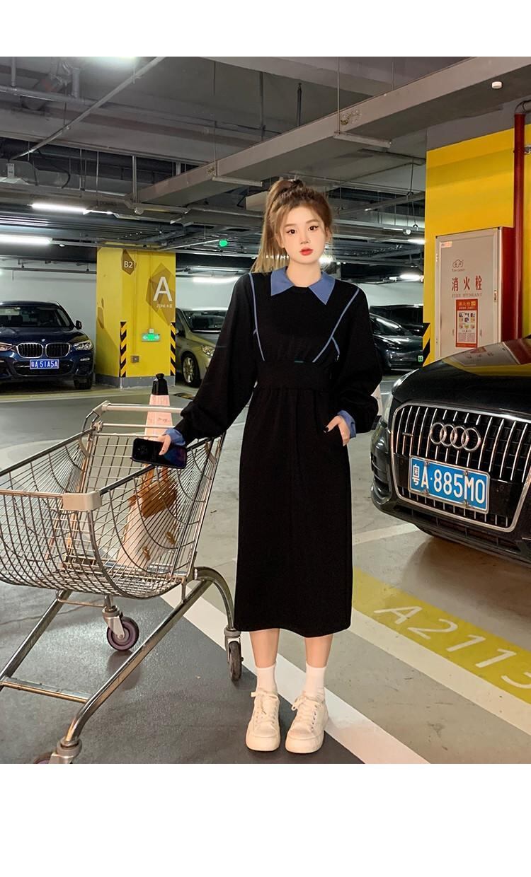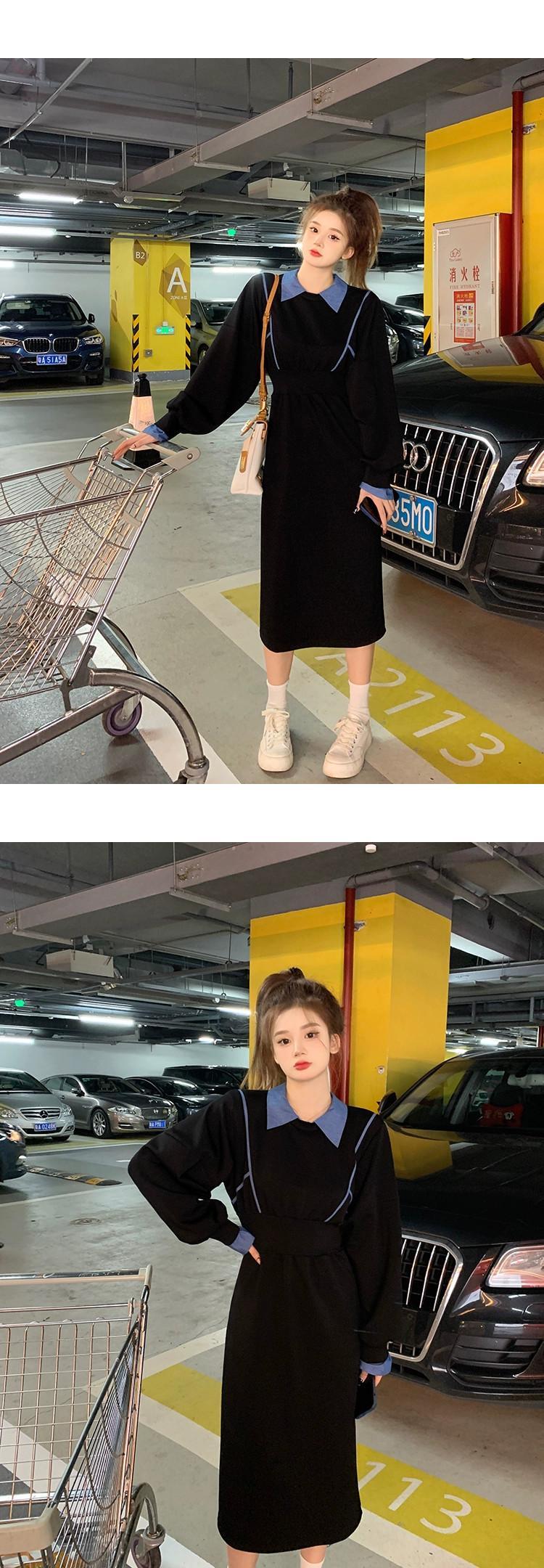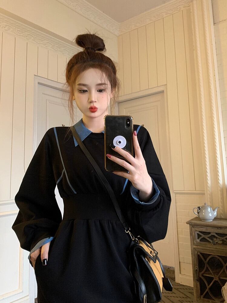 黒長袖ドレスの女性の秋 2023 新しいフレンチレトロウエスト痩身ユニークなシックなロングスカート ブラック オータム 秋物 8571646225893946