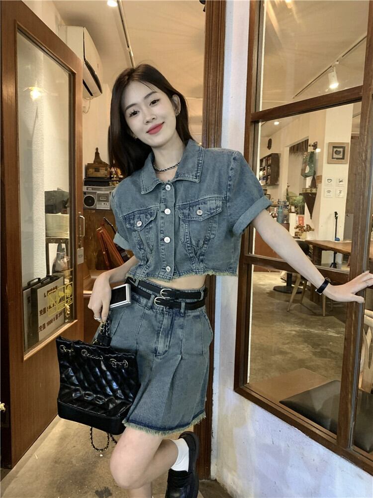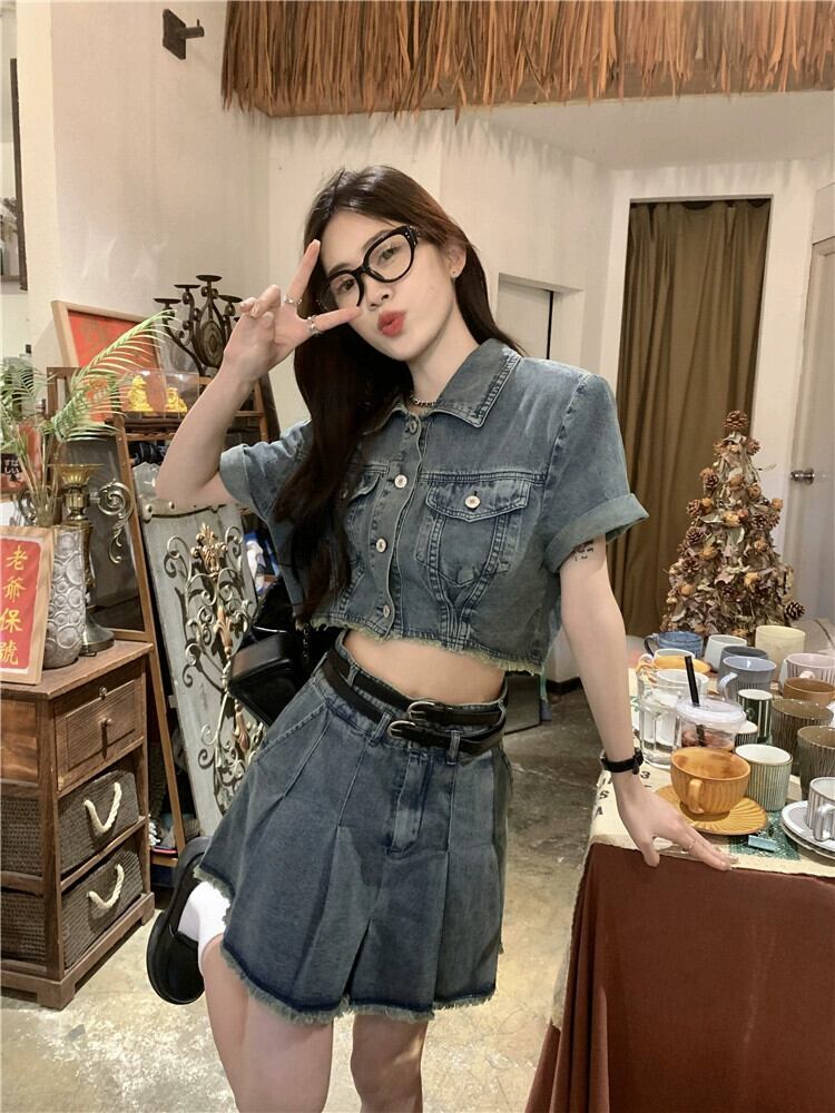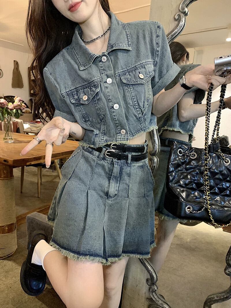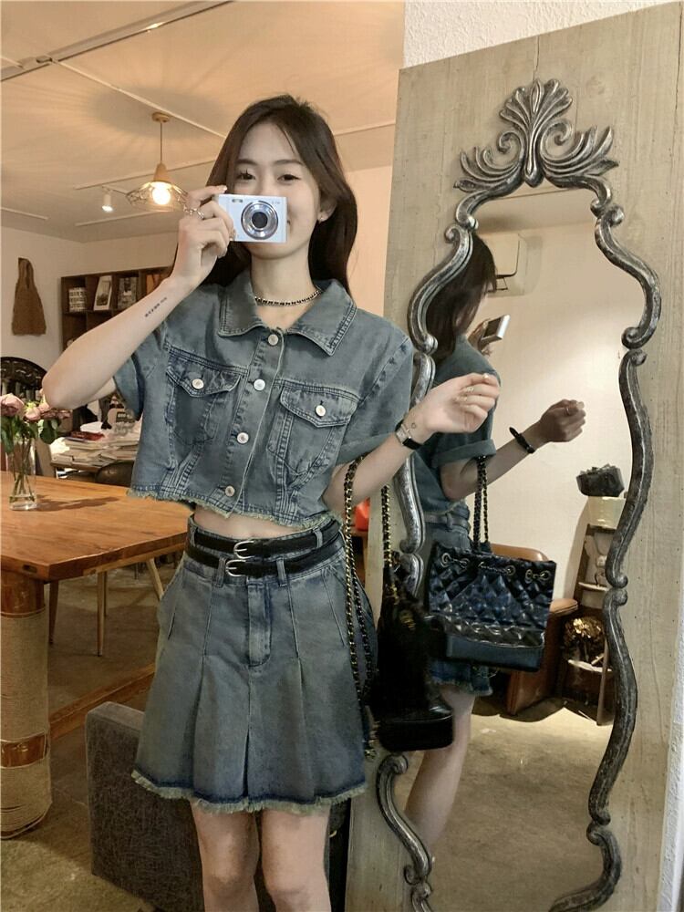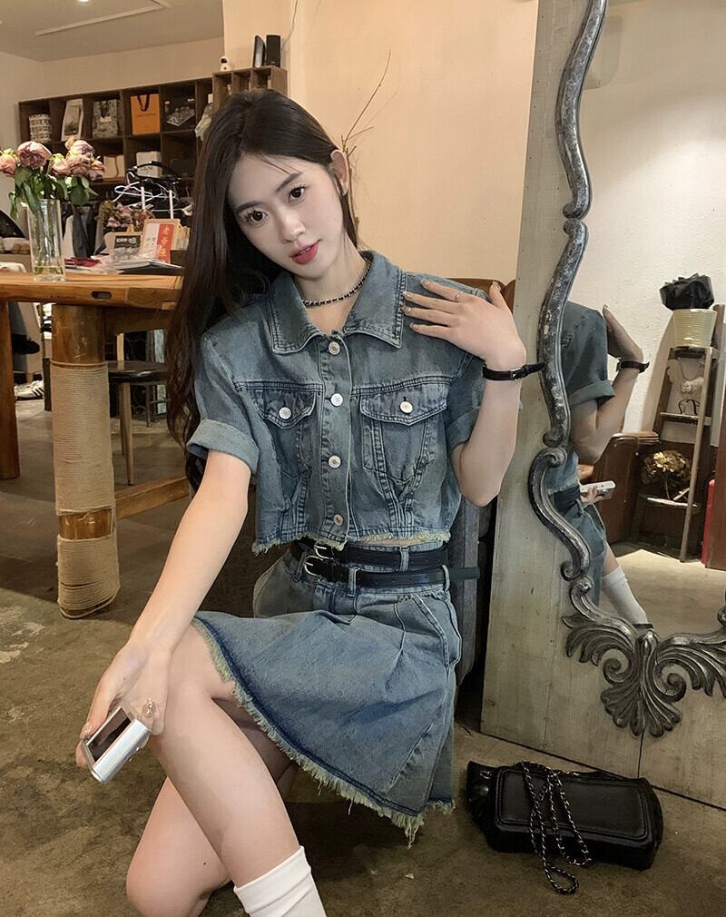 ローエッジデニム半袖ジャケットの女性の夏 2023 新しい香港スタイルのレトロシックな甘くてスパイシーなショートトップ 大人ガーリー スウィート キュート カジュアル サマー 夏物 8571653719076674