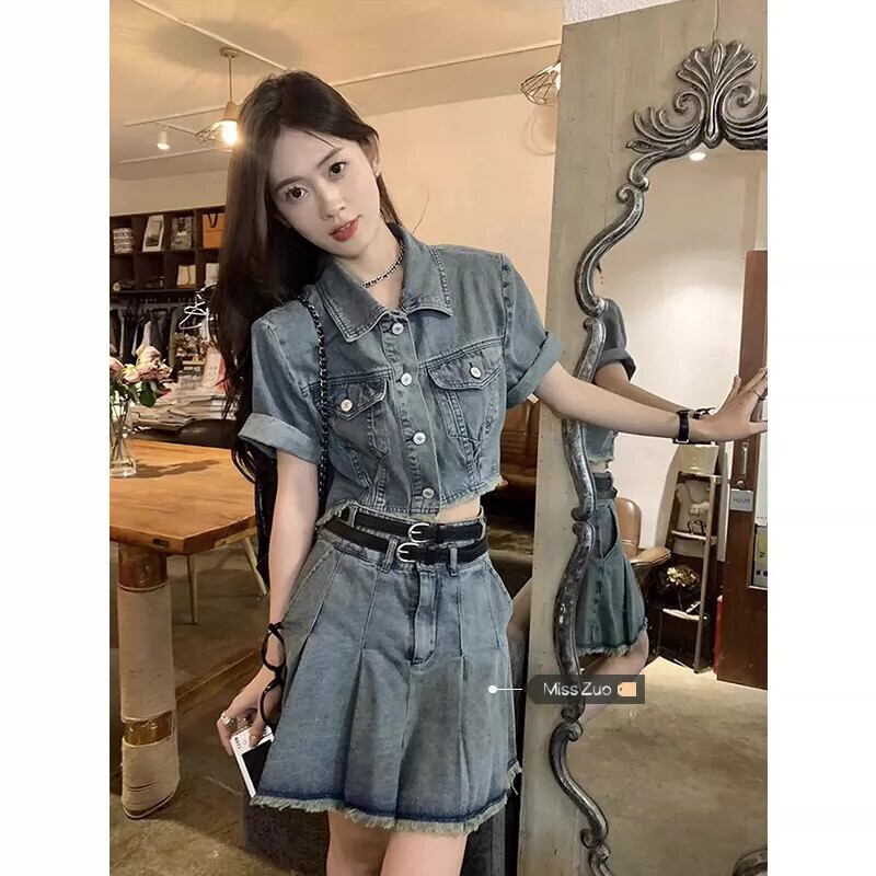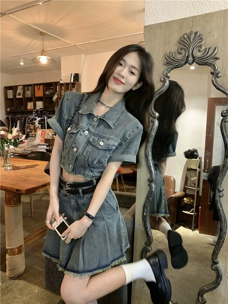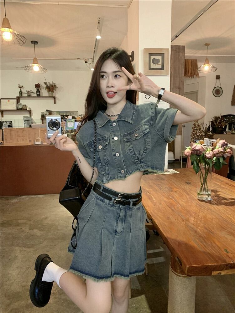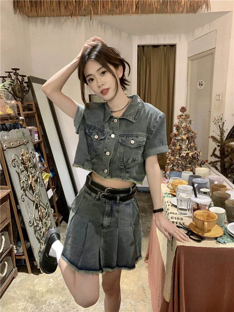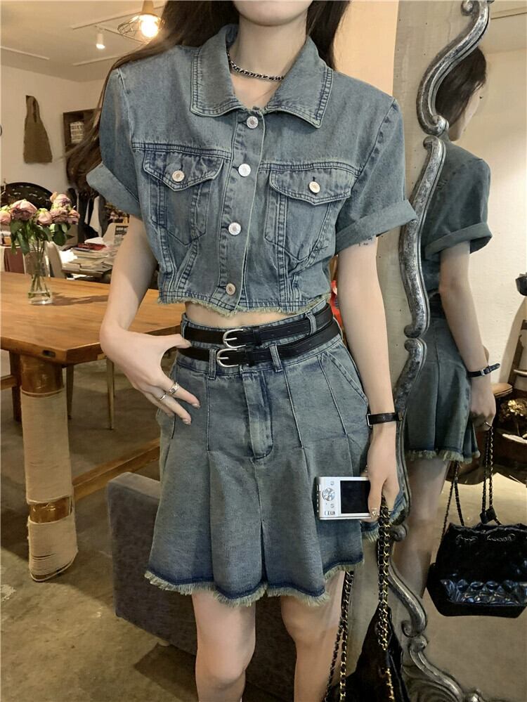 ローエッジデニム半袖ジャケットの女性の夏 2023 新しい香港スタイルのレトロシックな甘くてスパイシーなショートトップ 大人ガーリー スウィート キュート カジュアル サマー 夏物 8571653719076674