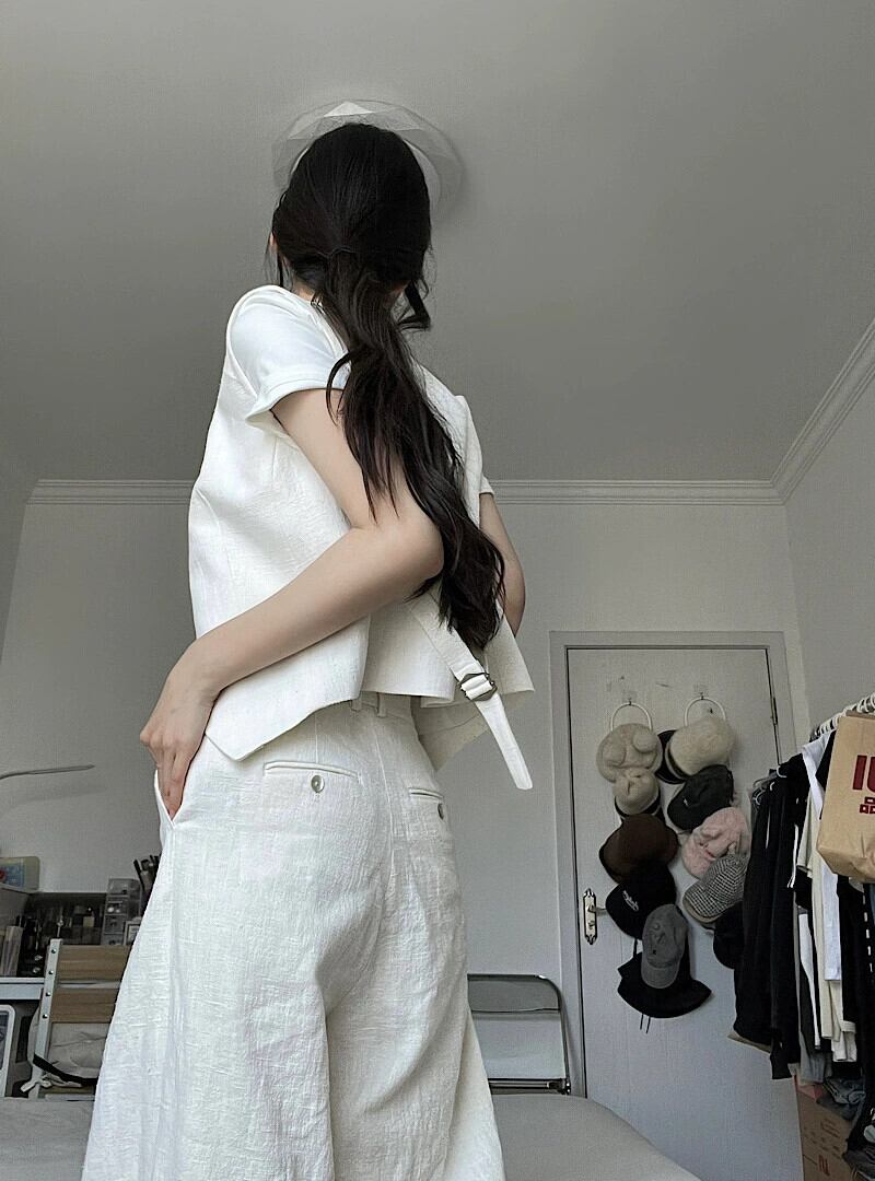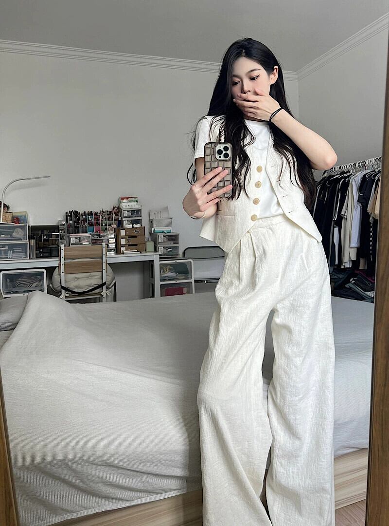 色:オフホワイトのVネックベスト,オフホワイトのテクスチャードスーツパンツ,ラウンドネック半袖T