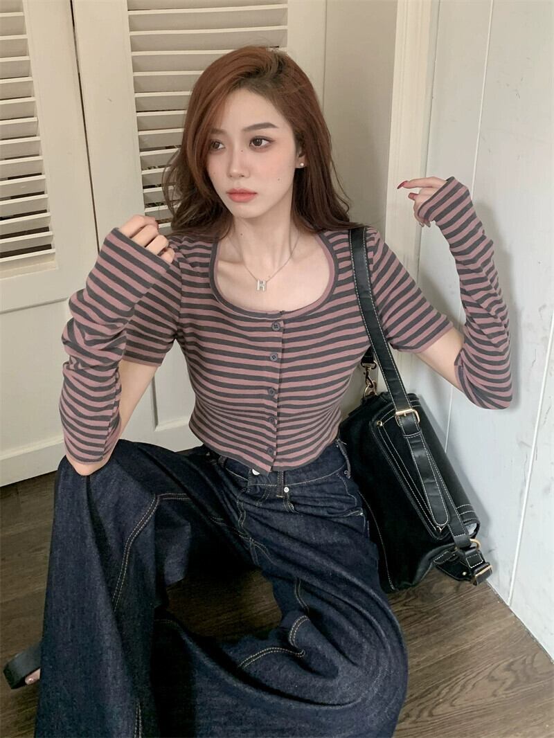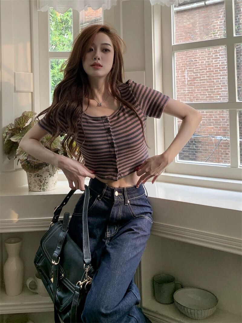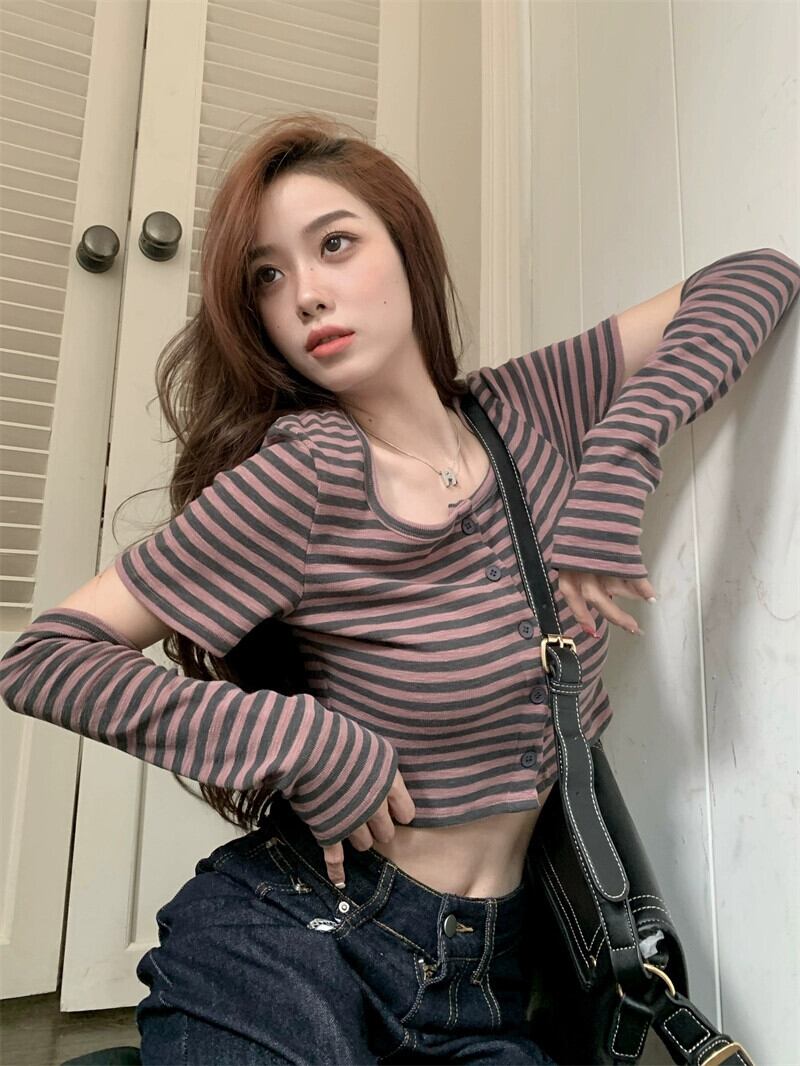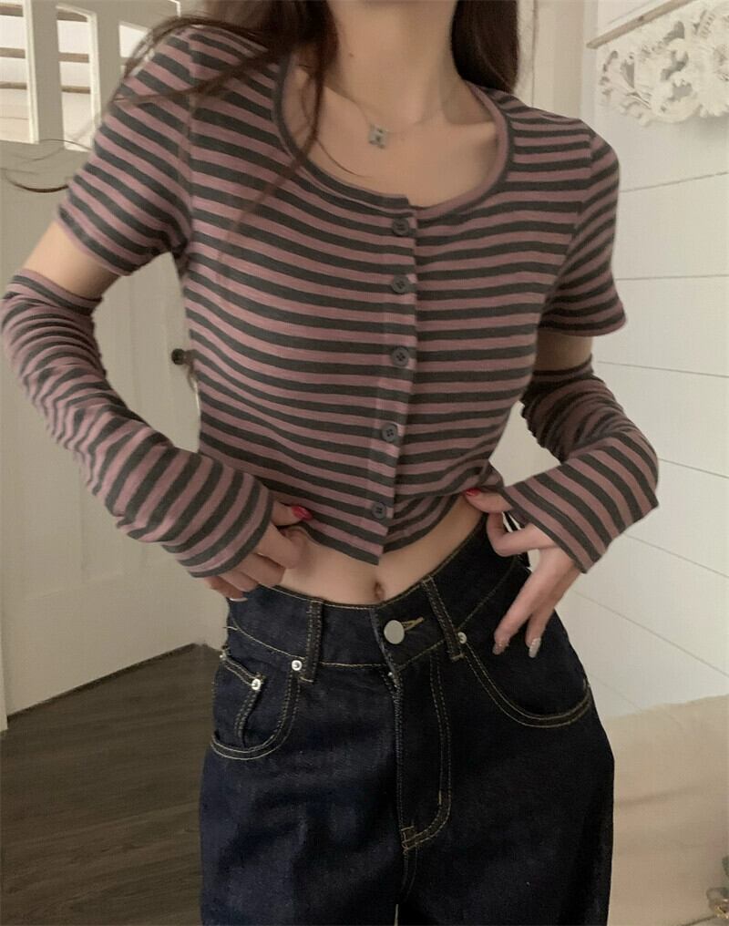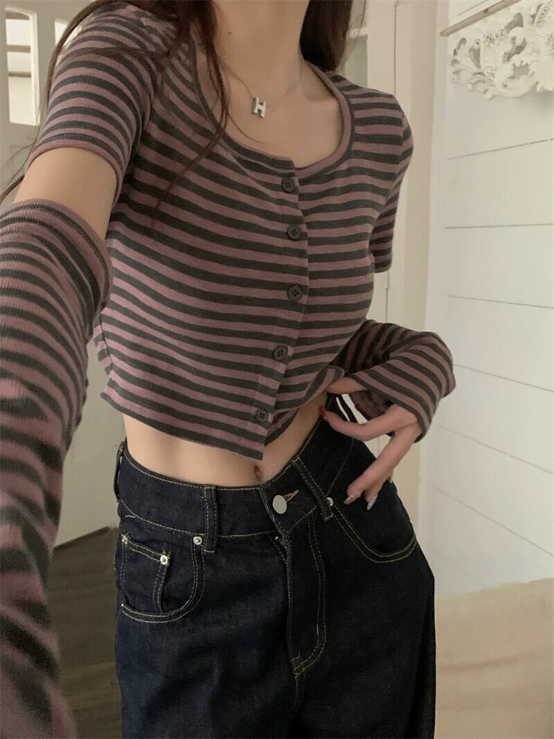 袖ストライプ半袖 Tシャツ女性の夏ホットガールシックなユニークなスリムへそ露出右肩ショートトップ ハーフスリーブ サマー 夏物 857162232646712