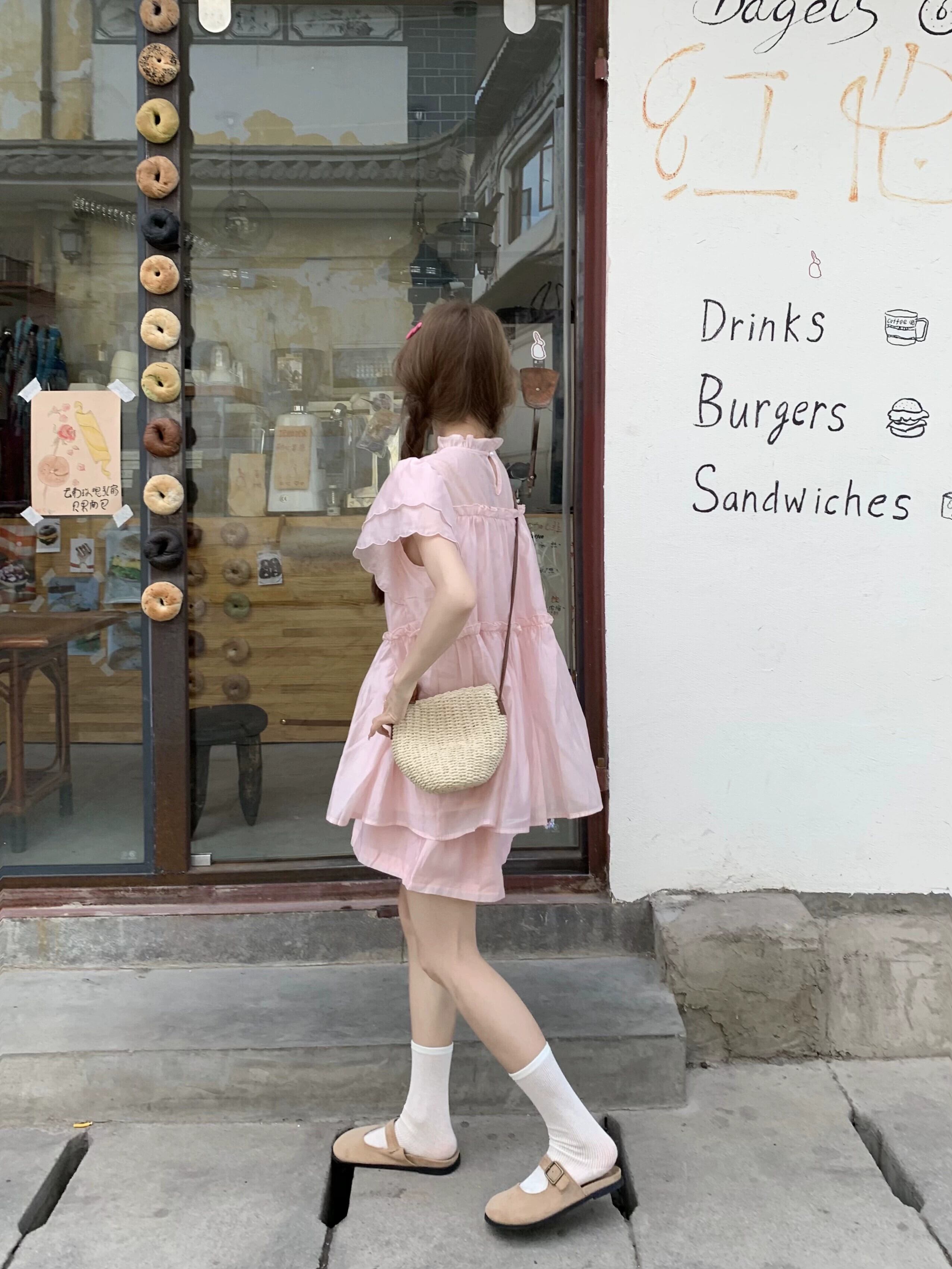 Feifei スリーブトップ女性の夏の 2023 新しいフランスの甘くて優しい風腹を覆うピンクのシャツ ツーピース スーツ 大人ガーリー スウィート キュート カジュアル サマー 夏物 8571652434521403