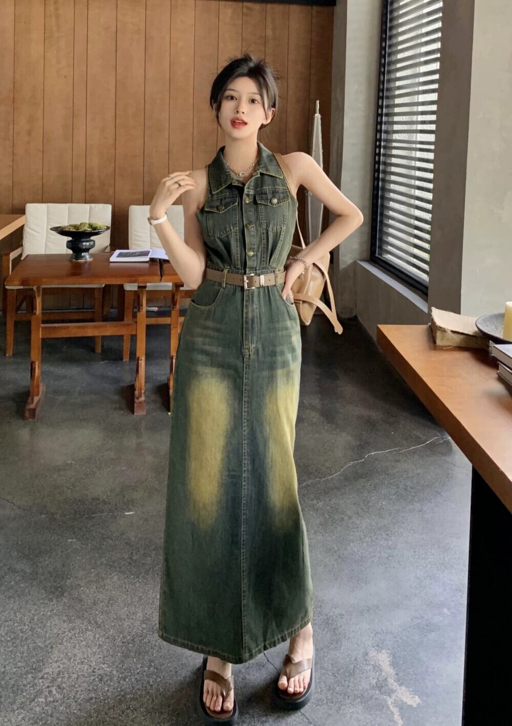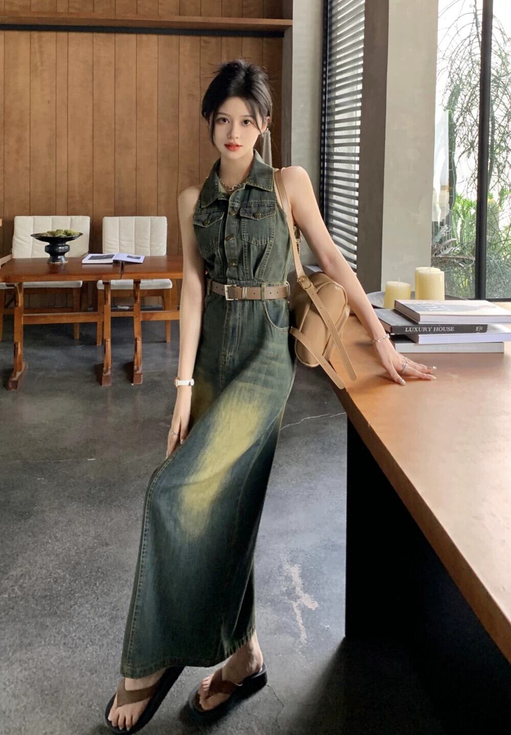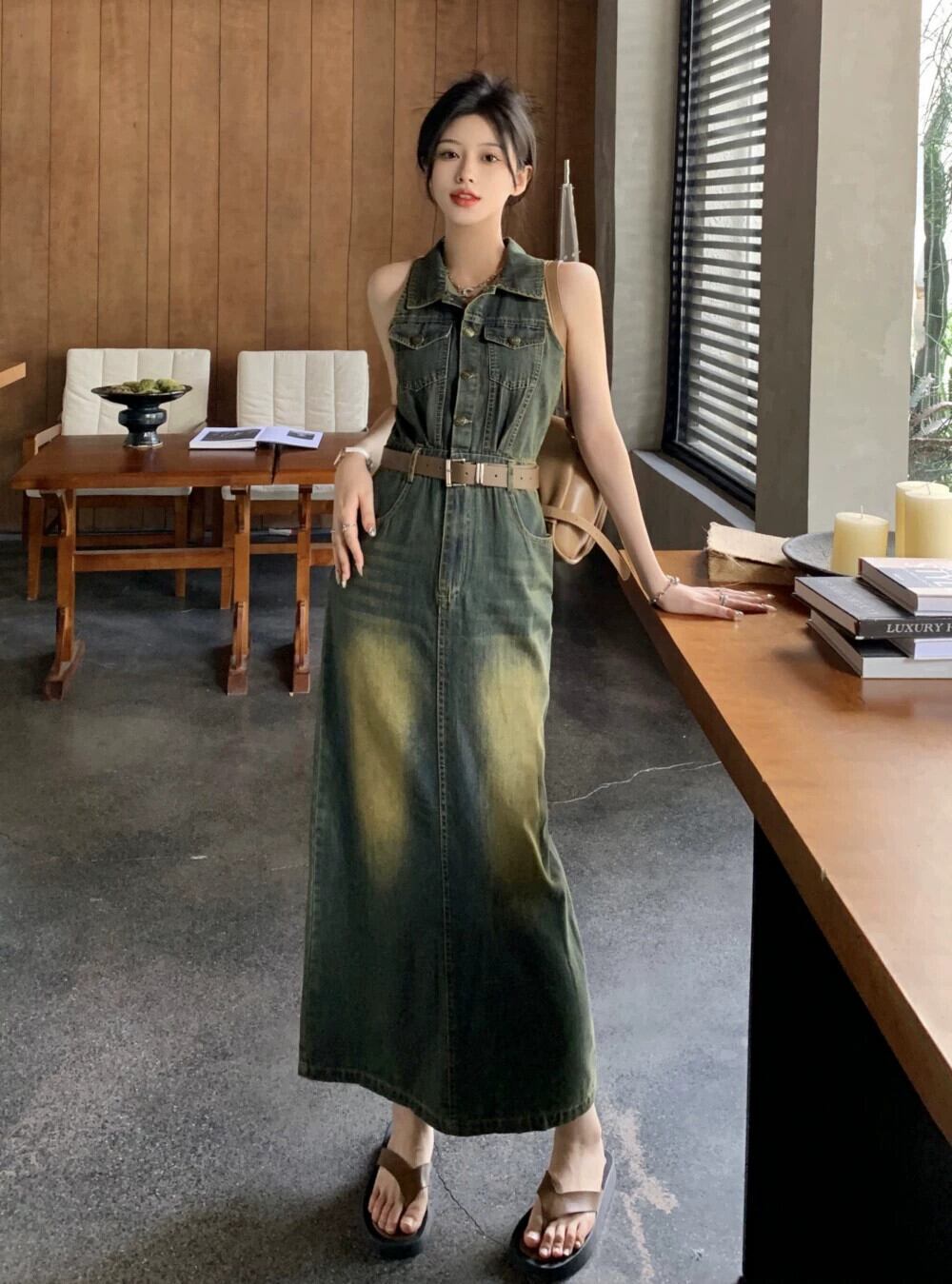 デニムベストドレス女性の新しい夏のスタイル香港スタイルレトロシックな気質ハイエンドスリットヒップカバーロングスカート サマー 夏物 8571623891093481