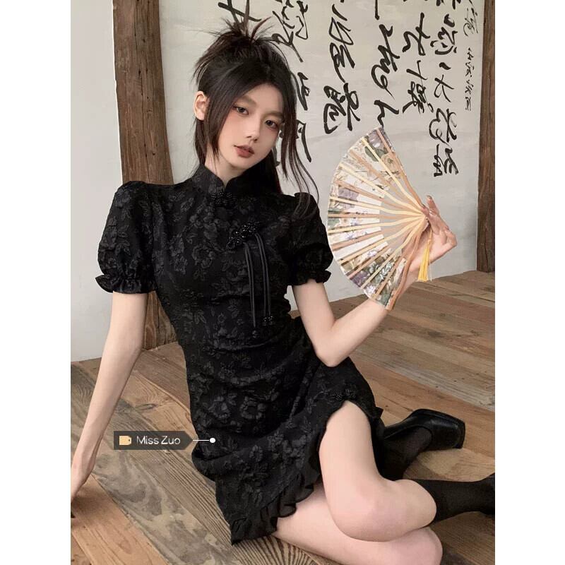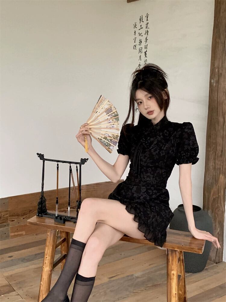 中国風の改良されたチャイナドレスの女性の夏 2023 新しいスタイルのフレンチスタイルのスリットパフスリーブ黒のスカート ブラック サマー 夏物 8571670007138200