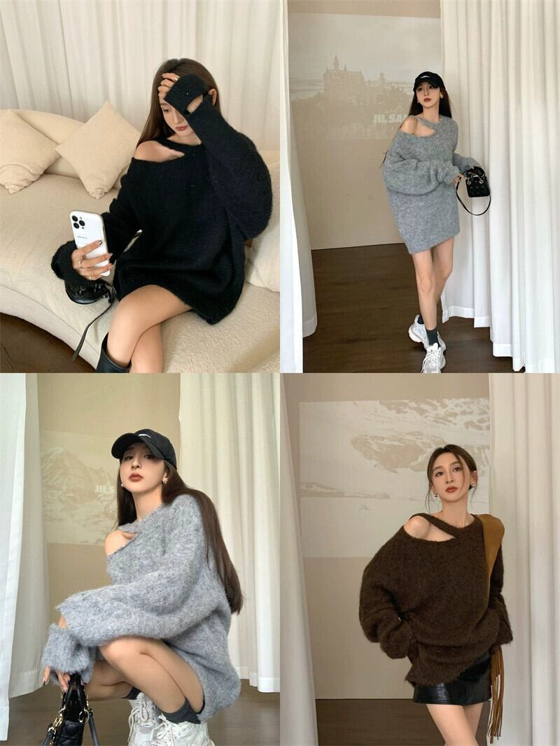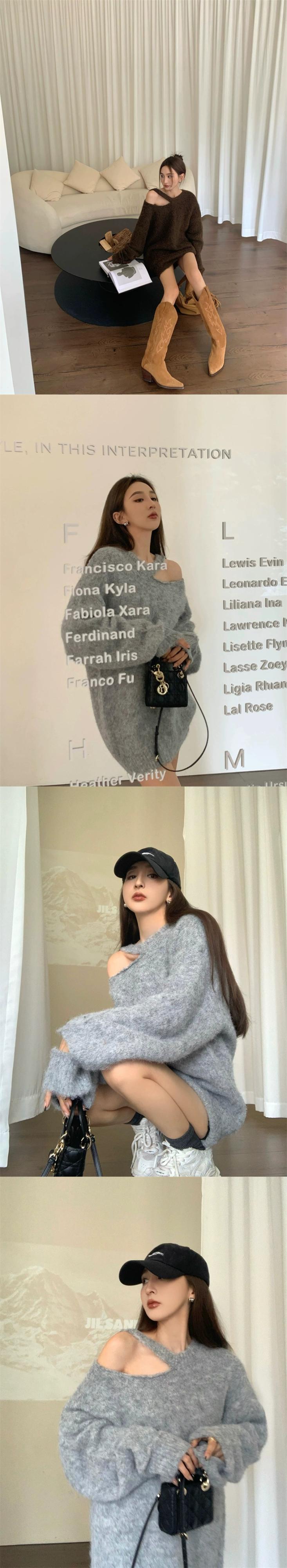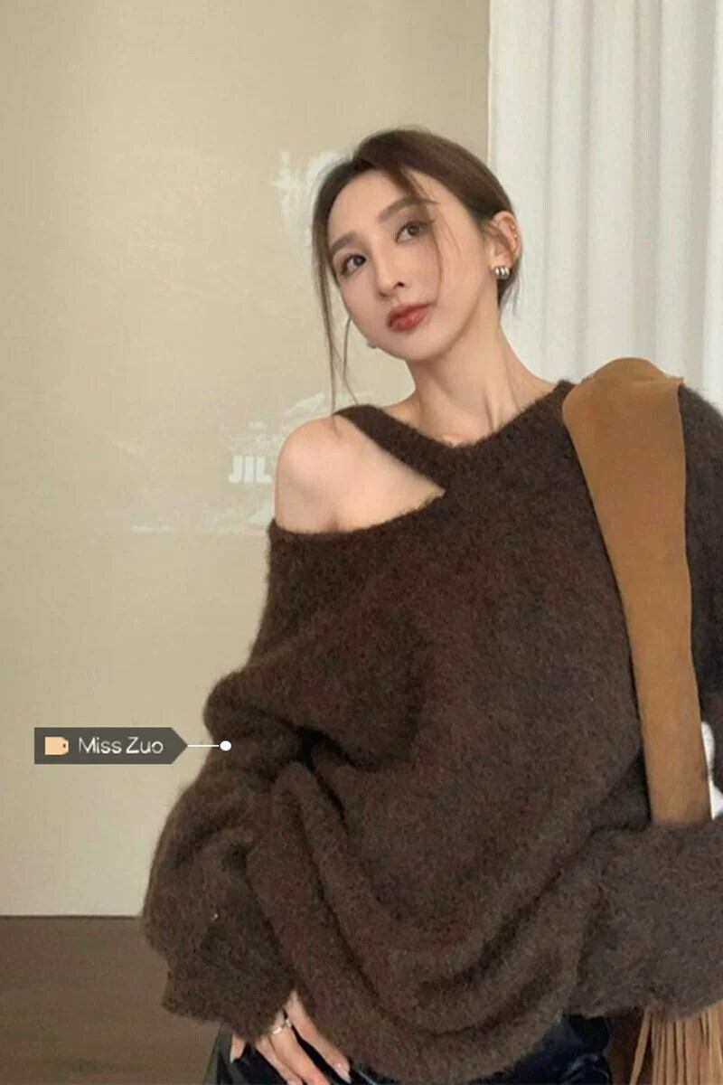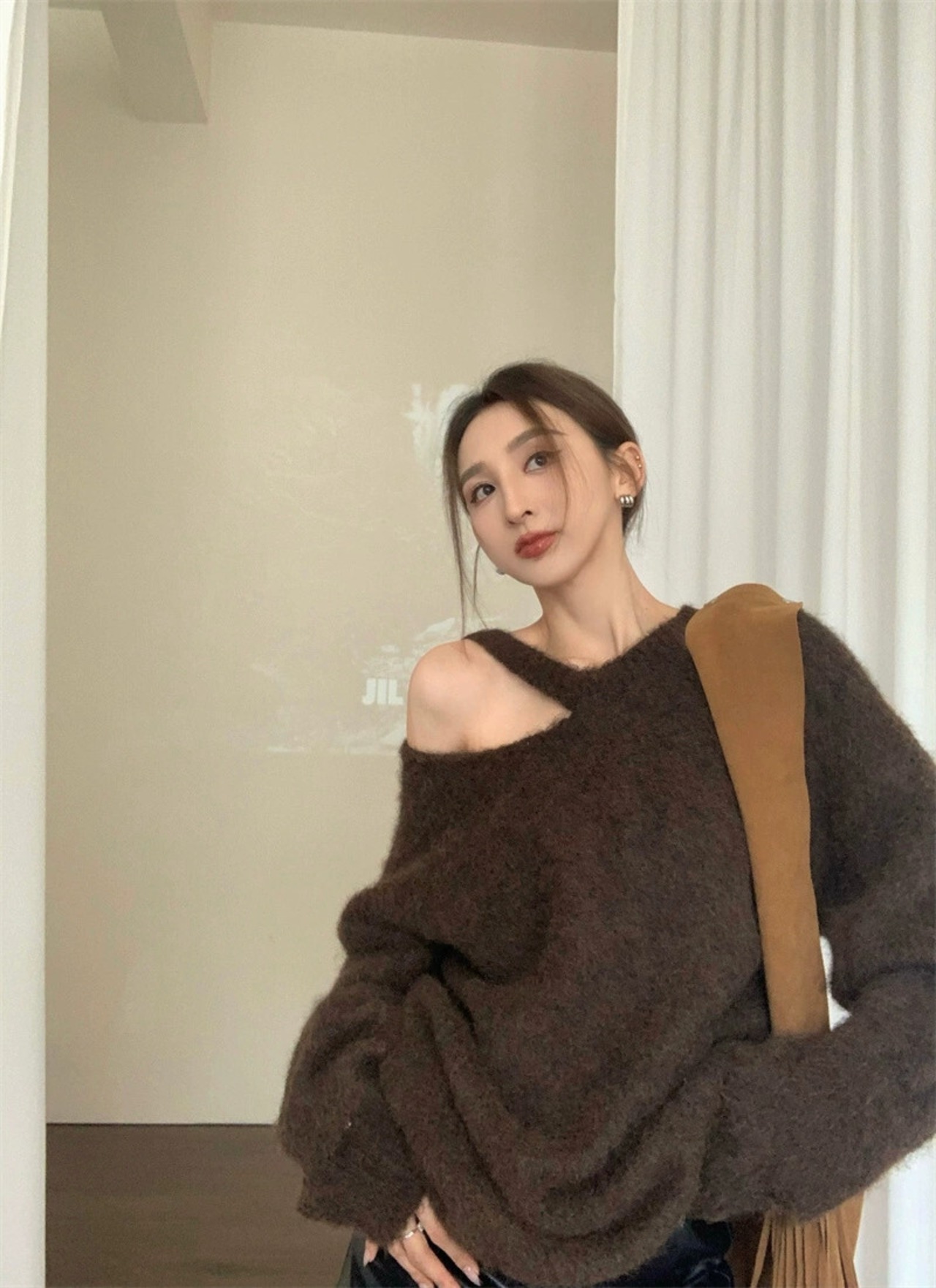 ニッチデザインの茶色のオフショルダーセーターの女性秋冬2023新しいスタイルルーズ怠惰なハイエンドレトロセーター オータム 秋物 ウィンター 冬物 8571622305400832