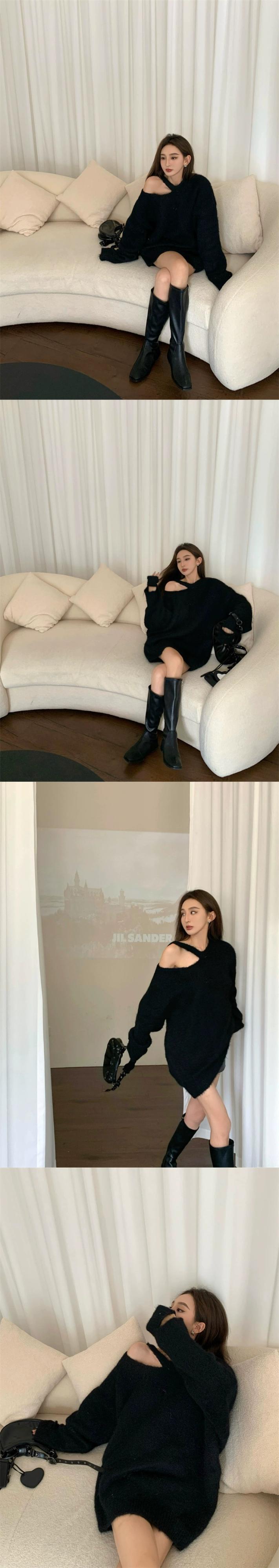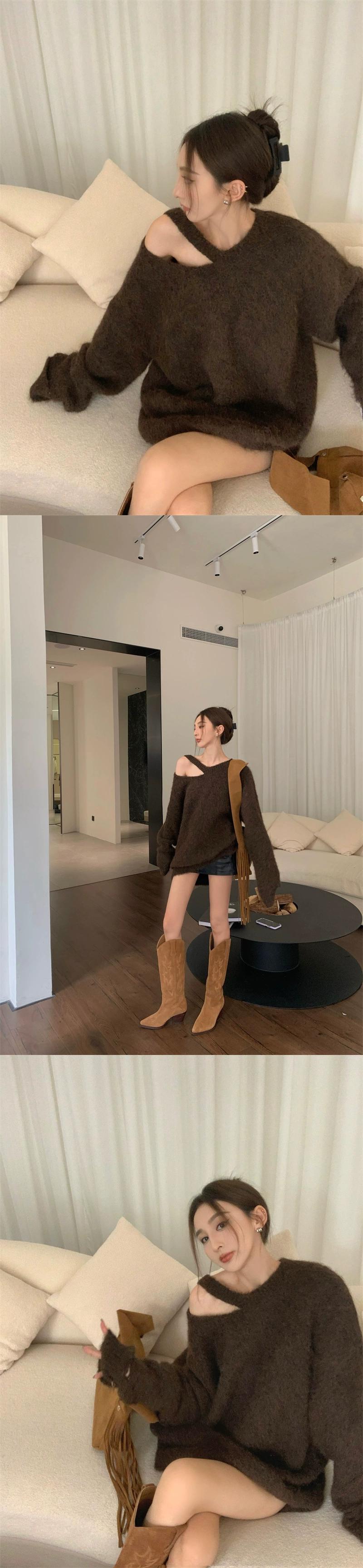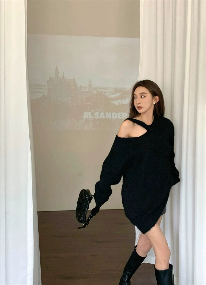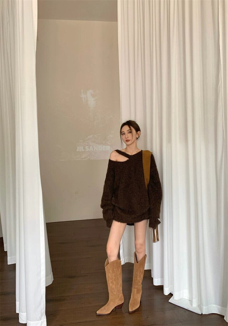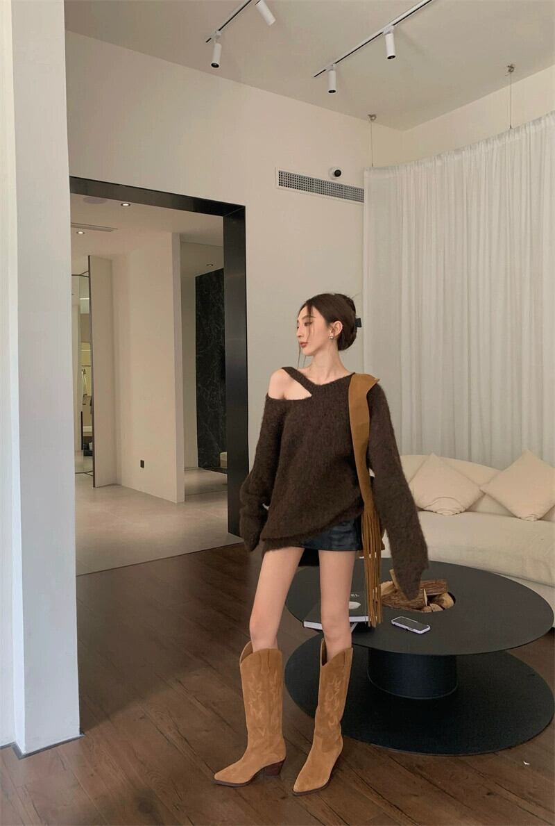 ニッチデザインの茶色のオフショルダーセーターの女性秋冬2023新しいスタイルルーズ怠惰なハイエンドレトロセーター オータム 秋物 ウィンター 冬物 8571622305400832