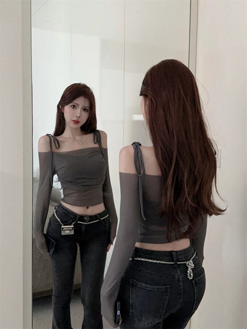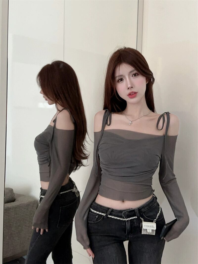 ワンショルダーショートトップ女性の夏 2023 新しい純粋な欲望ネクタイセクシーなシースルーシックなメッシュ長袖 Tシャツ ロング サマー 夏物 ピュア 8571686356323716