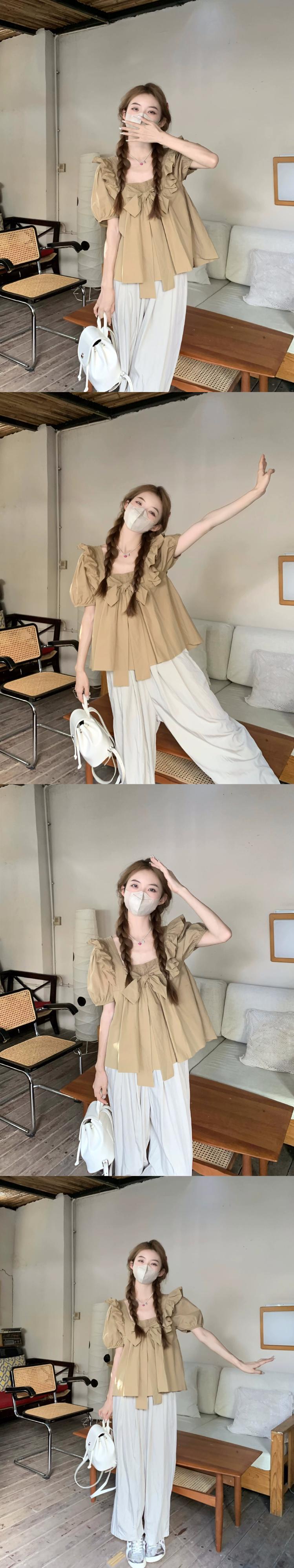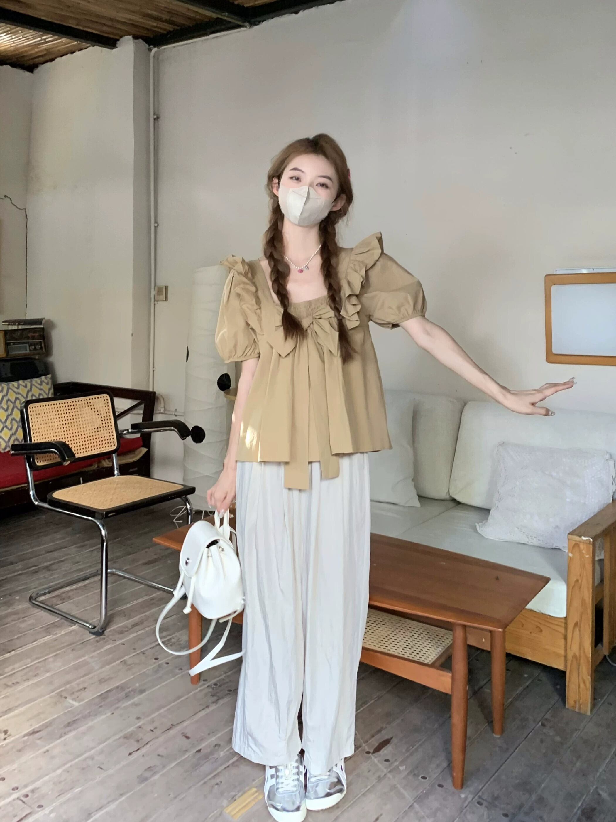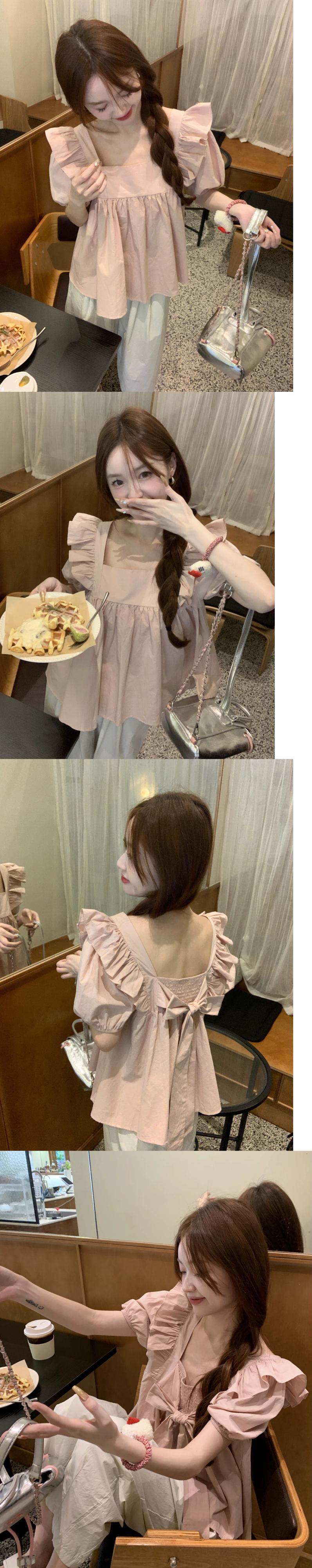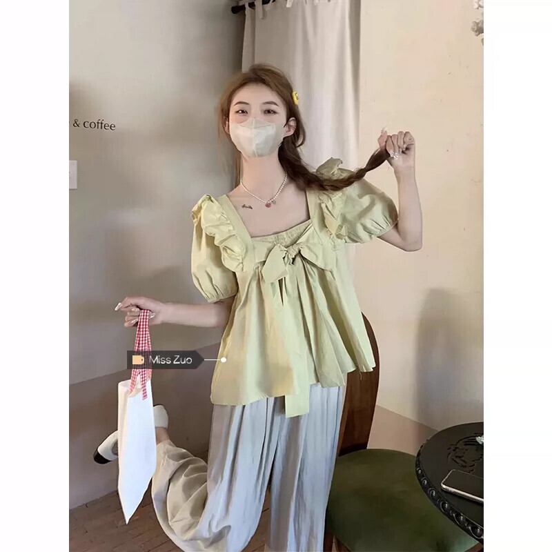 フリルスクエアカラートップレディース2023夏新作甘い年齢軽減前後二着グリーンパフスリーブシャツ 大人ガーリー スウィート キュート カジュアル サマー 夏物 スクウェア 8571658437432601
