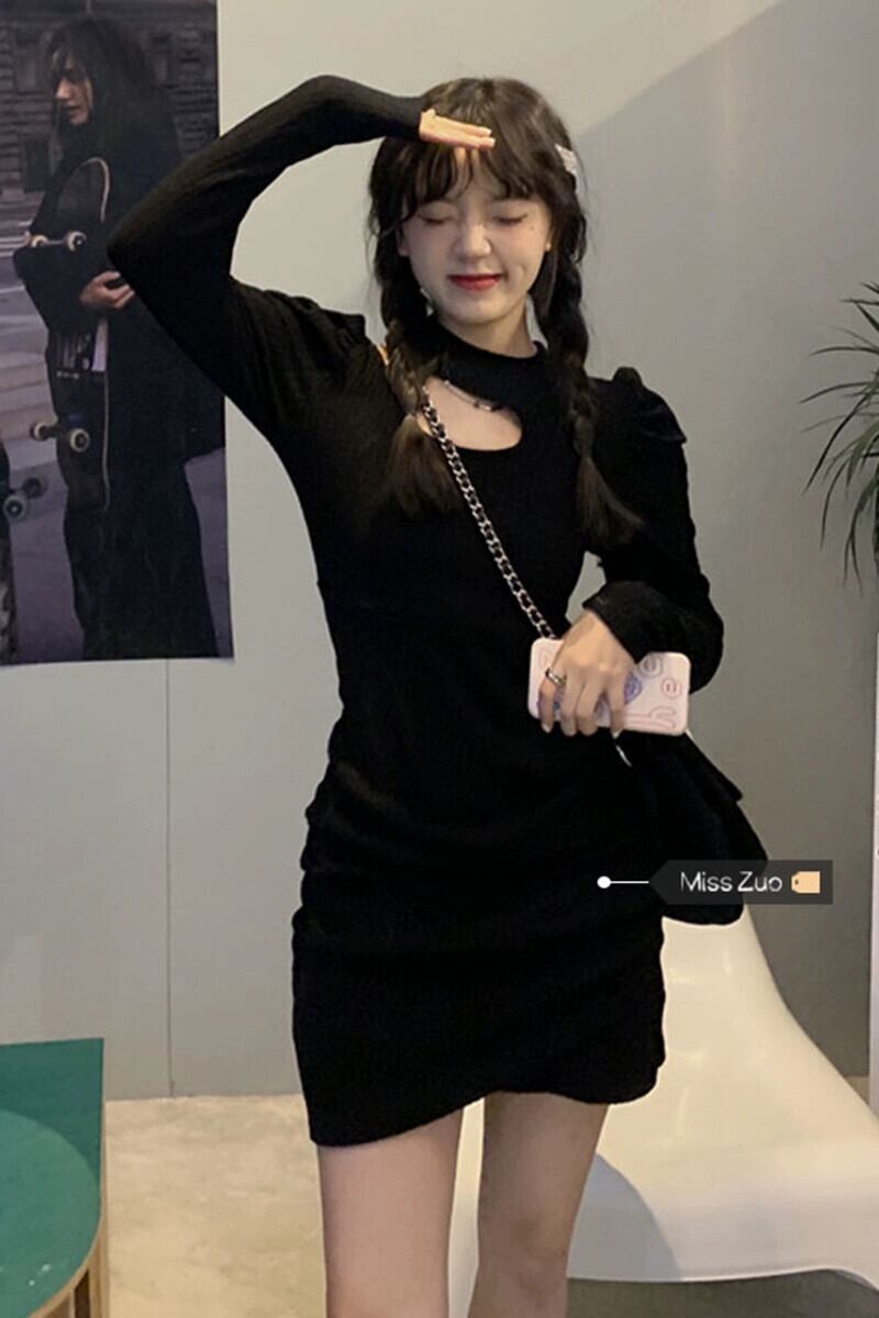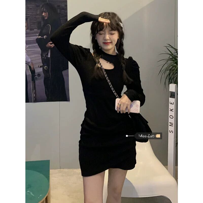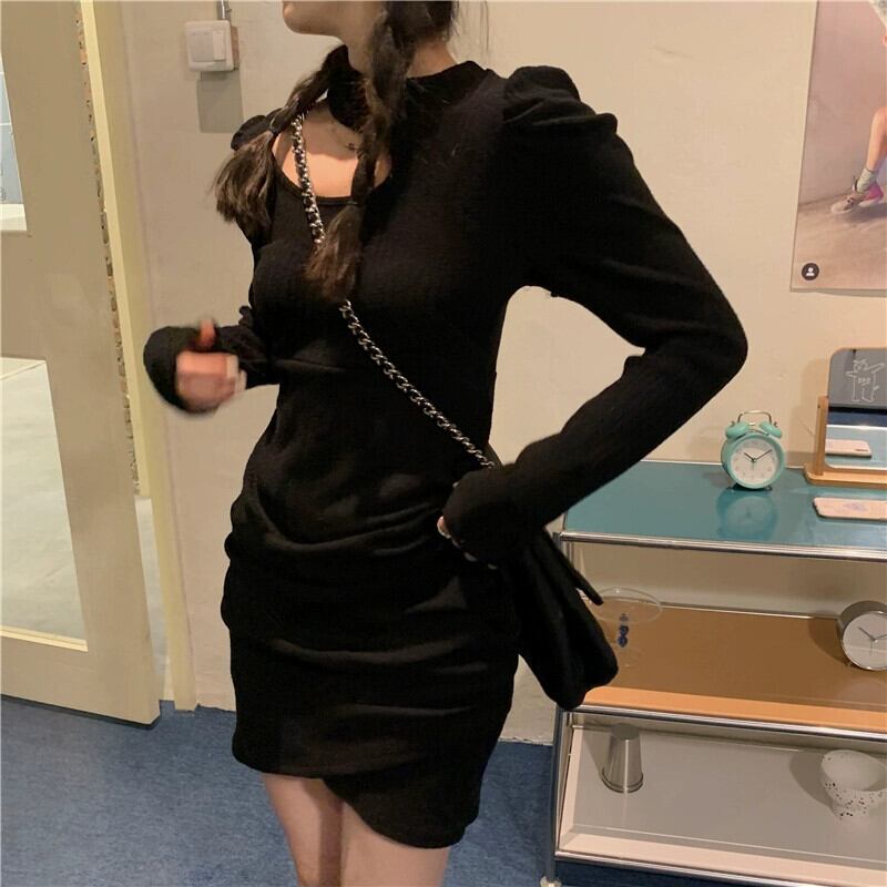 春の黒のオフショルダーボトムドレスレディース、シックでスイート、スリムフィット、ヒップハグ、パフスリーブ、イレギュラースカート ブラック 大人ガーリー スウィート キュート カジュアル スプリング 春物 8571632975955491