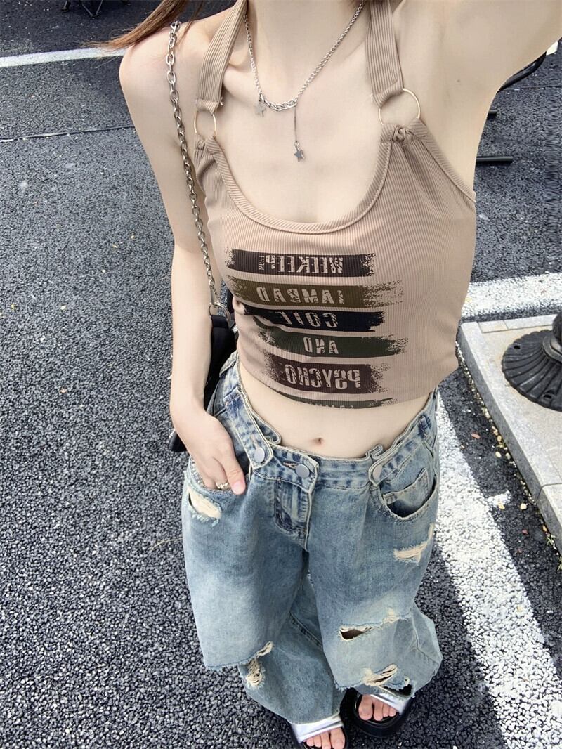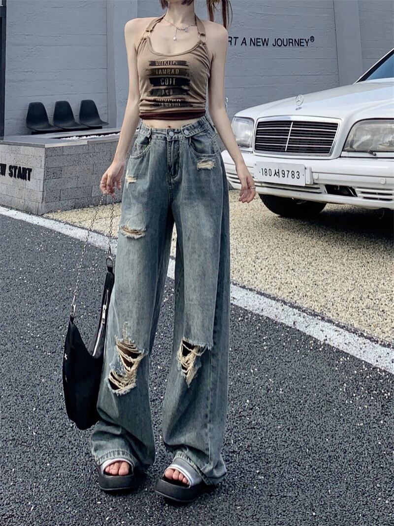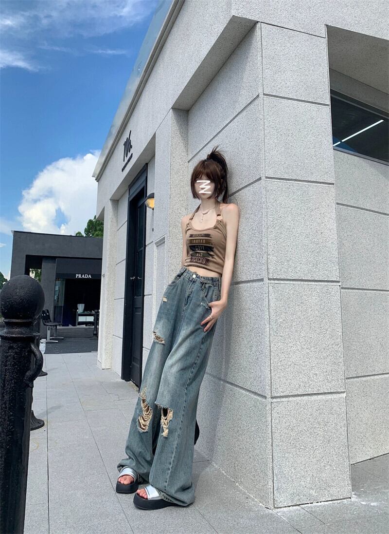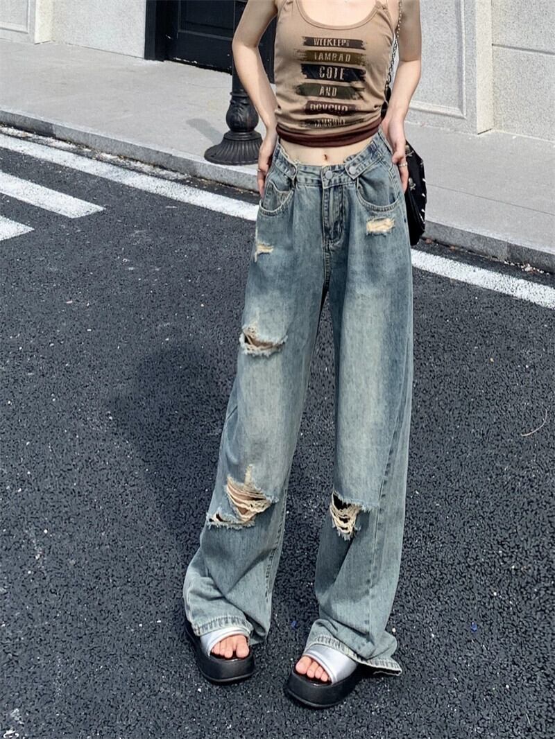 リップドジーンズレディースルーズストレート夏アメリカンレトロウエスト調節可能なハイウエストフロアレングスワイドレッグロングパンツ サマー 夏物 アジャスタブル 8571624383177833