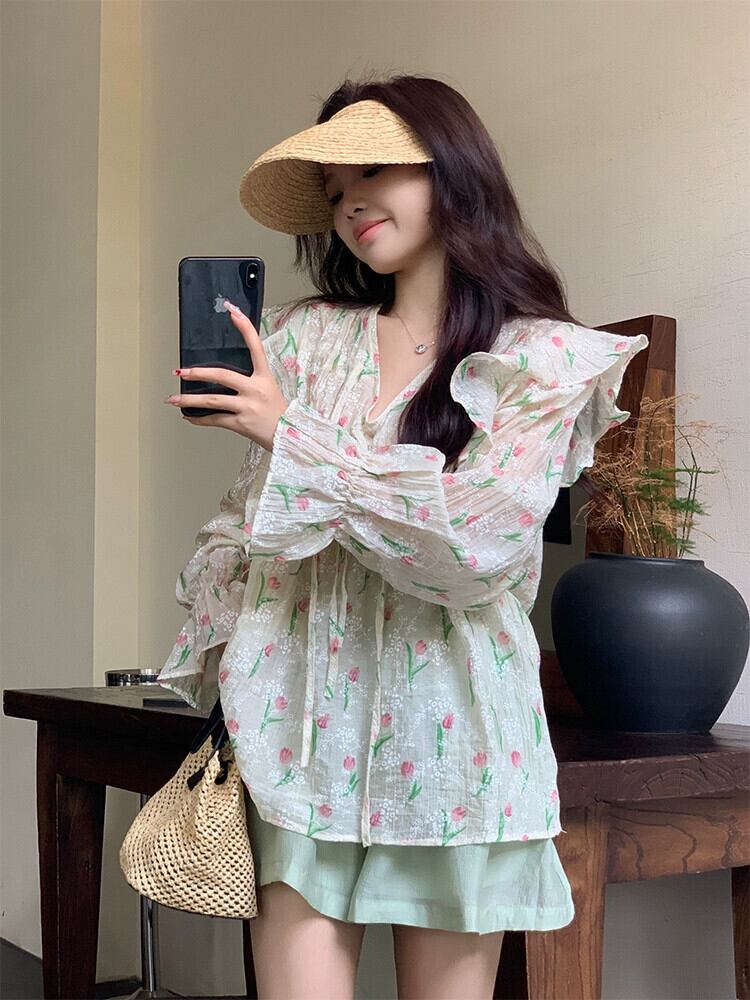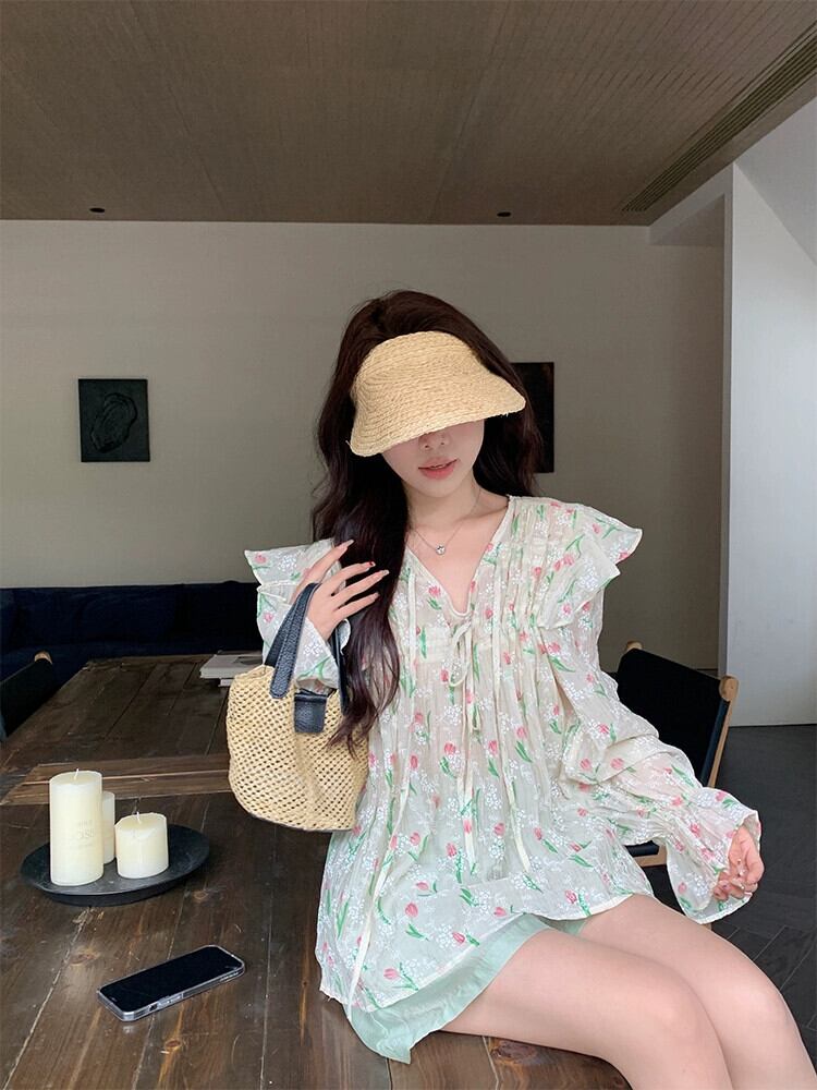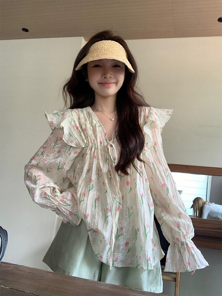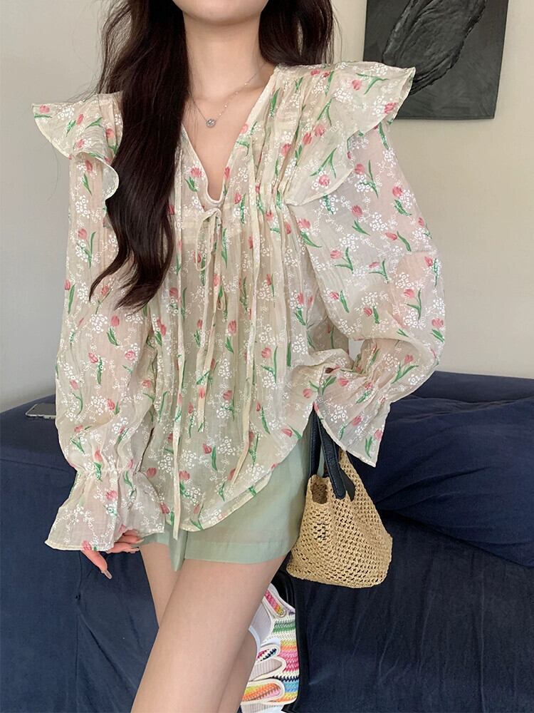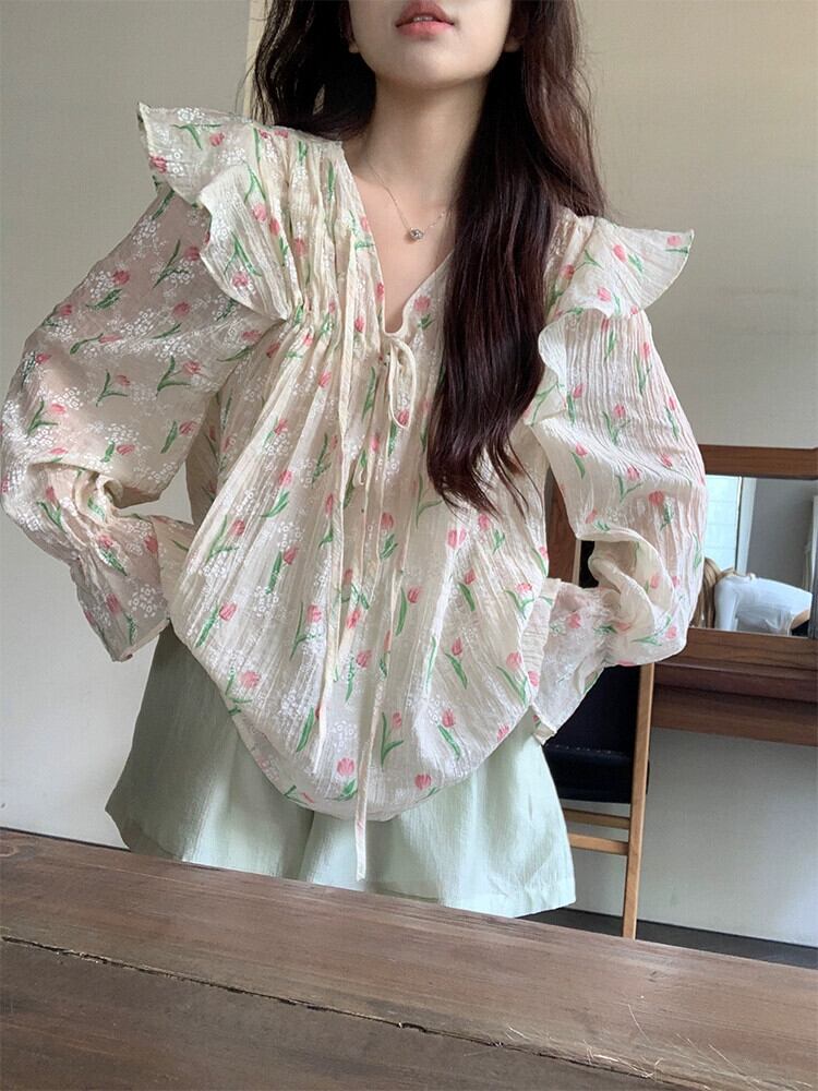 チューリップ花柄シャツレディース夏デザインニッチフレンチ甘くて優しいスーパーフェアリーフリル長袖トップス ロング 大人ガーリー スウィート キュート カジュアル サマー 夏物 8571612331182223