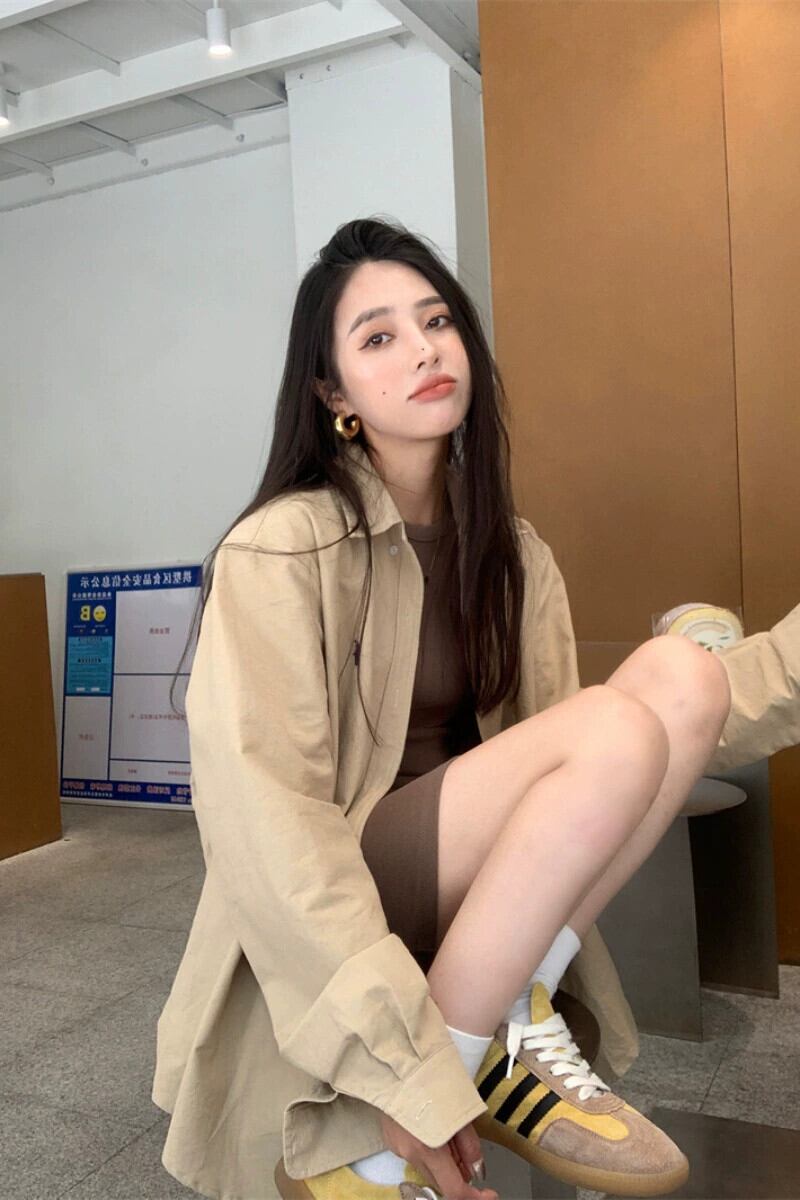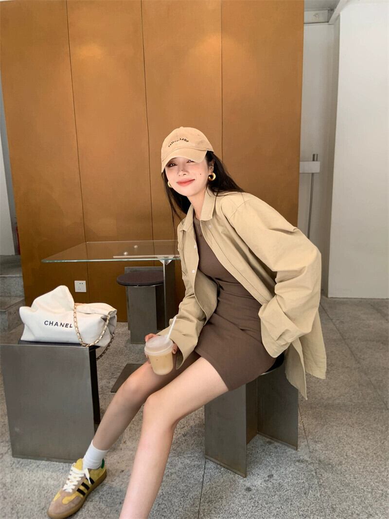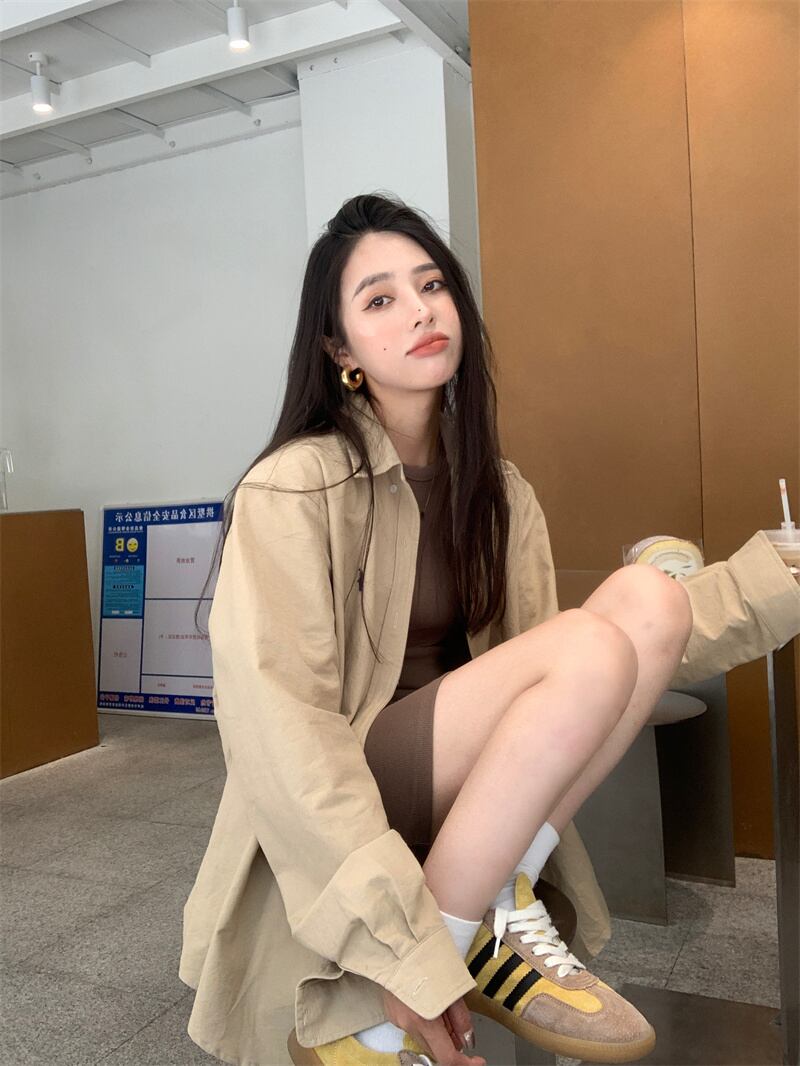 カーキカジュアルシャツジャケットレディースデザインニッチシャツ2023秋新作ルーズ長袖トップ ロング オータム 秋物 8571645117223927