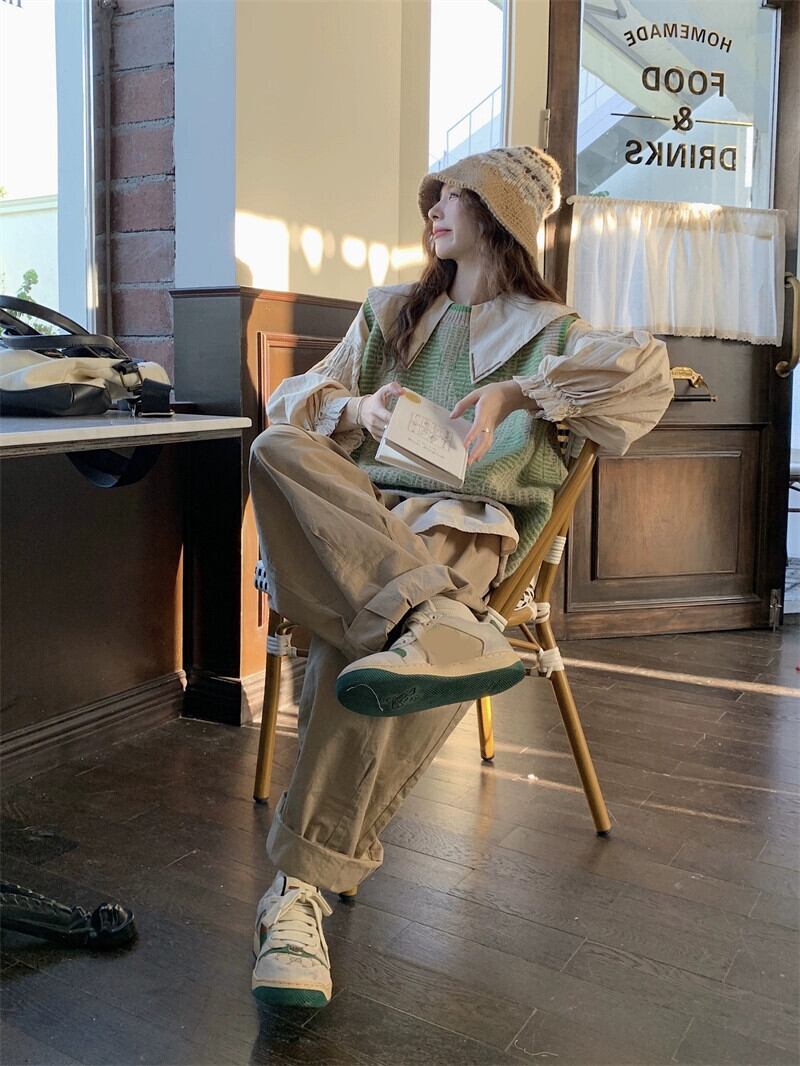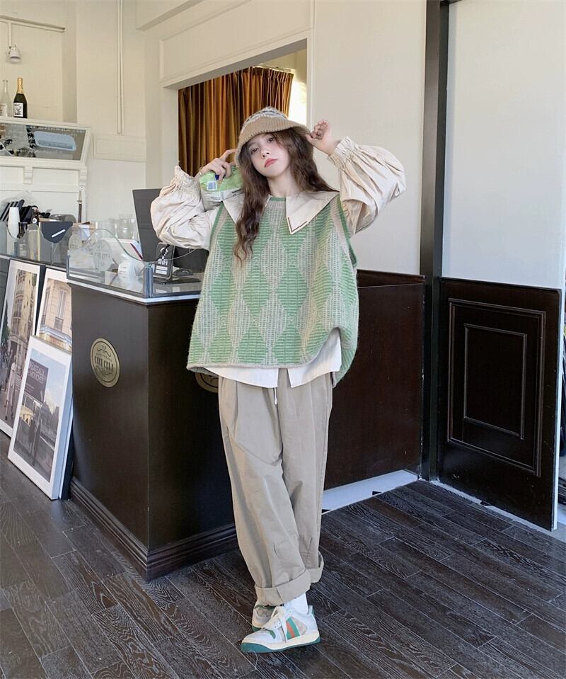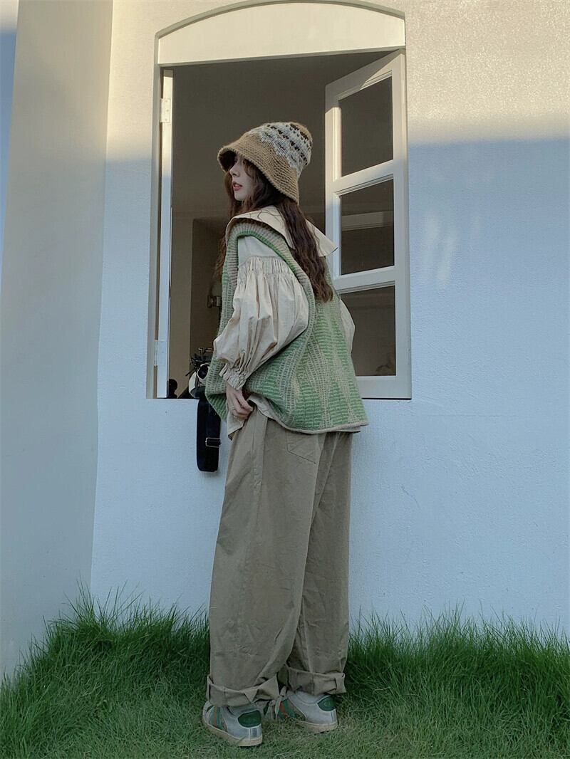 色:パフスリーブ大襟シャツ,太い脚のパンツ,グリーンベスト