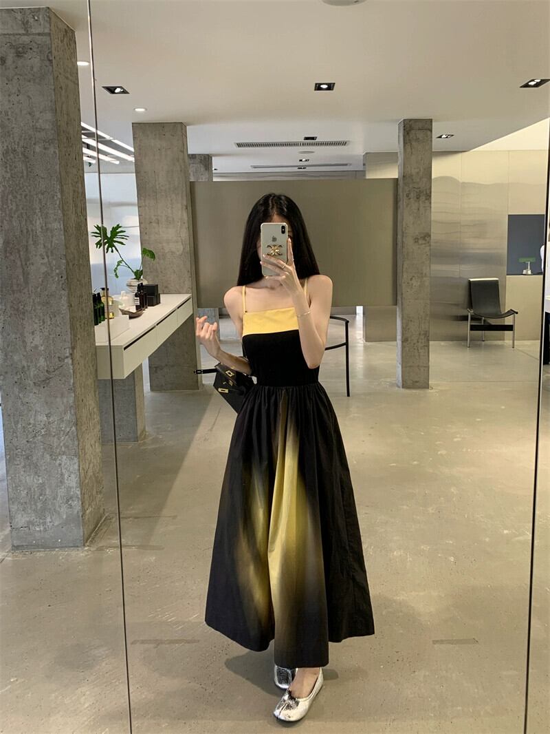 タイダイサスペンダードレスの女性の夏 2023 新しいスタイルフレンチスタイルハイエンドコントラストカラーウエスト痩身ロングスカート サマー 夏物 8571614019933051