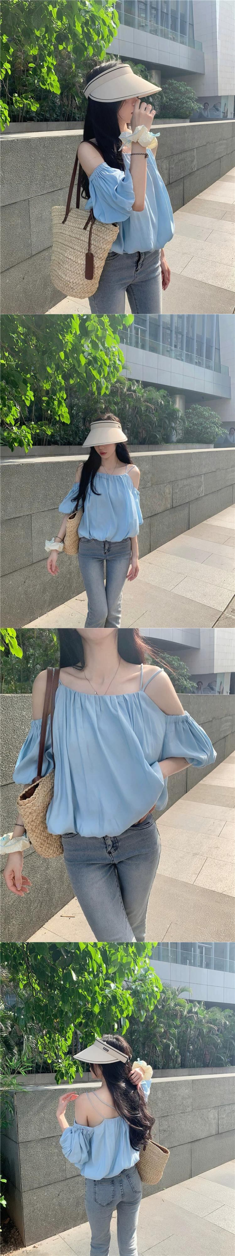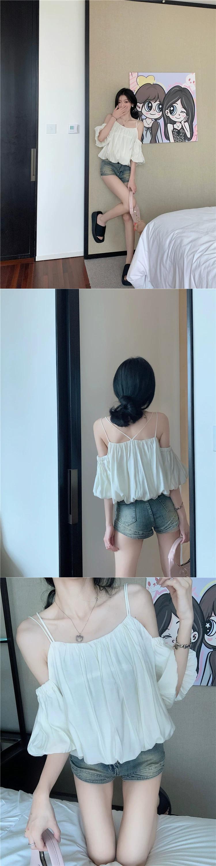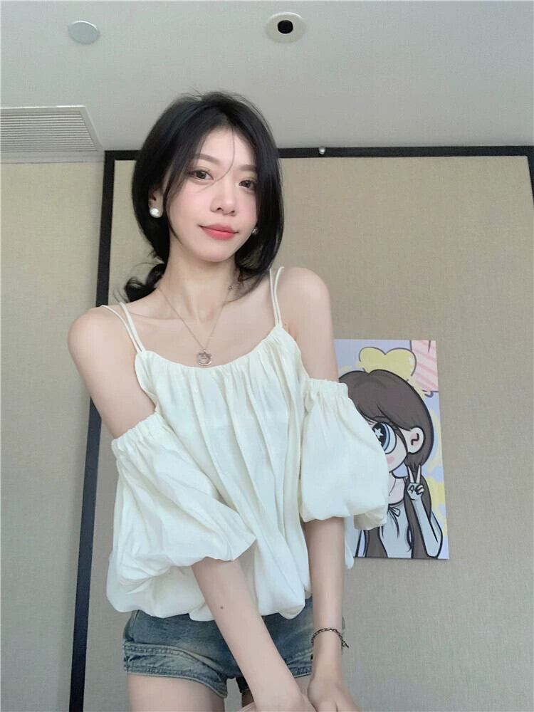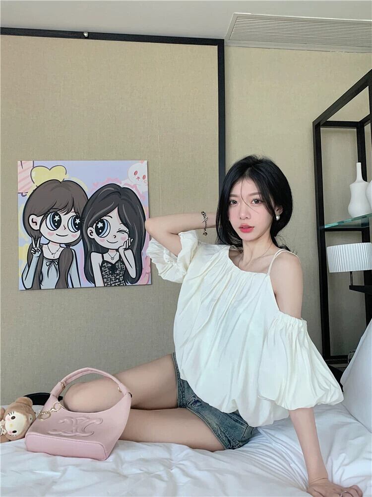 ワンショルダーサスペンダートップ女性の夏の2023新しいスタイルフランスのスーパーフェアリー腹を覆うブルーパフスリーブシフォンシャツ サマー 夏物 8571672645486727
