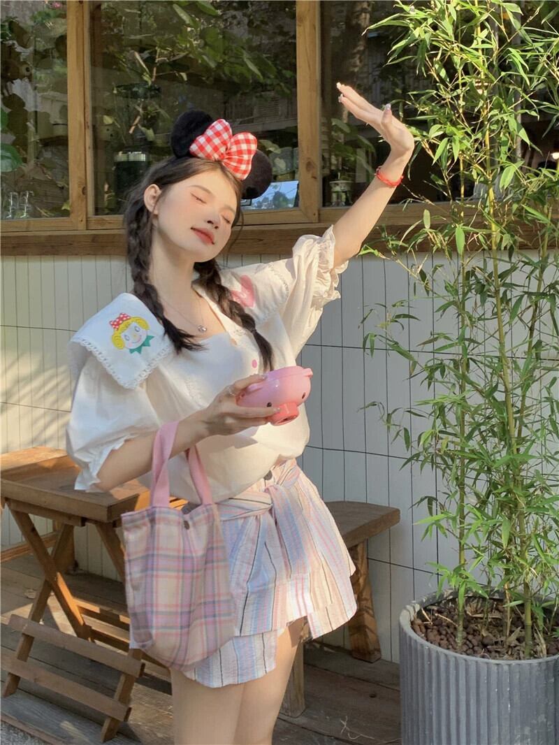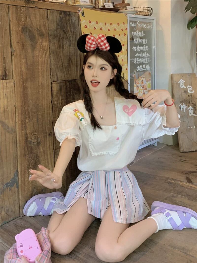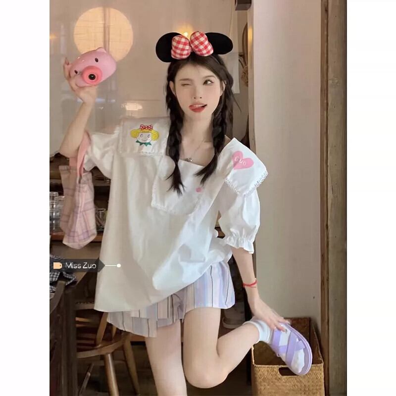 ネイビーカラー半袖シャツ女性 2023 夏の新スタイルかわいい、甘い、年齢を減らす、西洋スタイルのデザインのトップ小さな人々 大人ガーリー スウィート キュート カジュアル サマー 夏物 8571648818528008