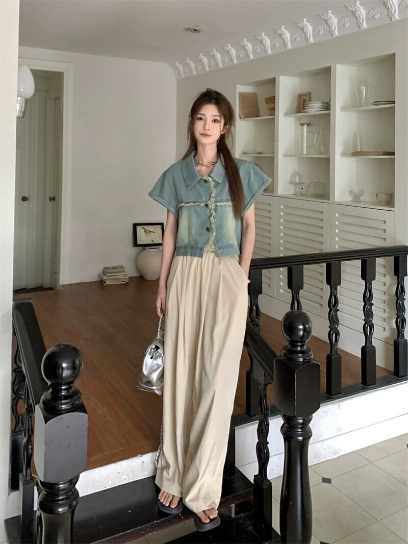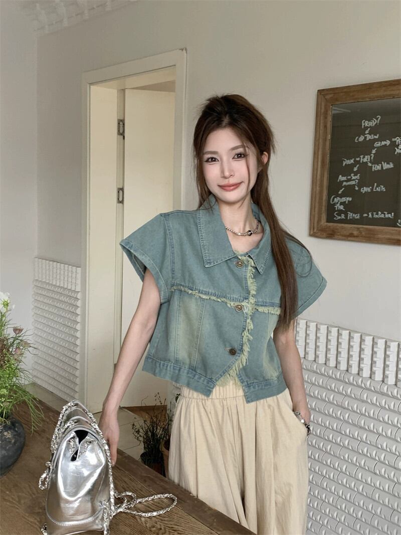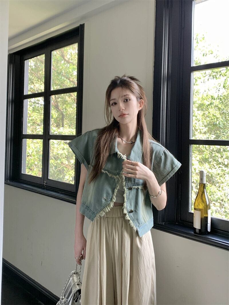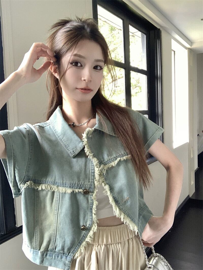 ローエッジデニム半袖ジャケットの女性の夏薄い 2023 新しい香港スタイルのレトロシックなデザインショートトップ サマー 夏物 8571646062491405