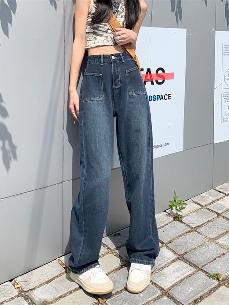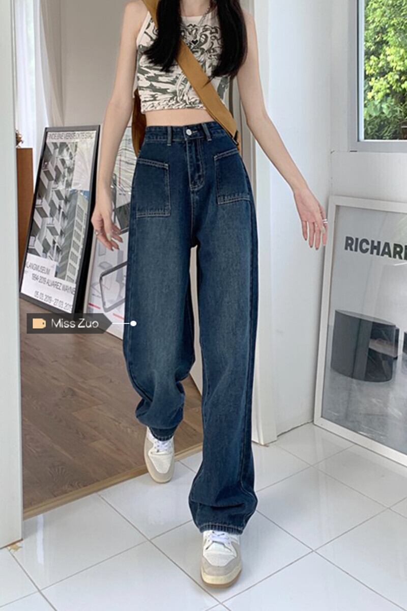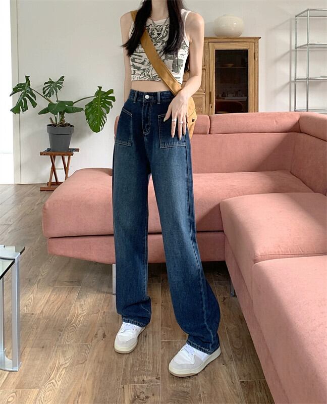 ブルーのワイドレッグジーンズの女性、ゆったりとしたストレートレッグの秋のニッチデザインパンツ、洋ナシ型の体をスリムにする小柄な人々 オータム 秋物 8571613186699565