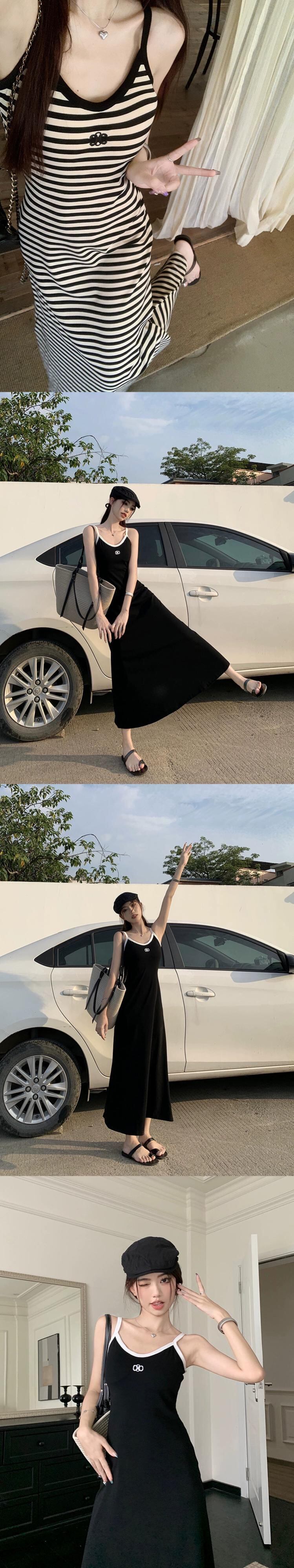 ストライプサスペンダードレスの女性の夏 2023 新しいスリムフィットニッチ気質ドレープ A ラインロングスカート サマー 夏物 Aライン 8571696188384830