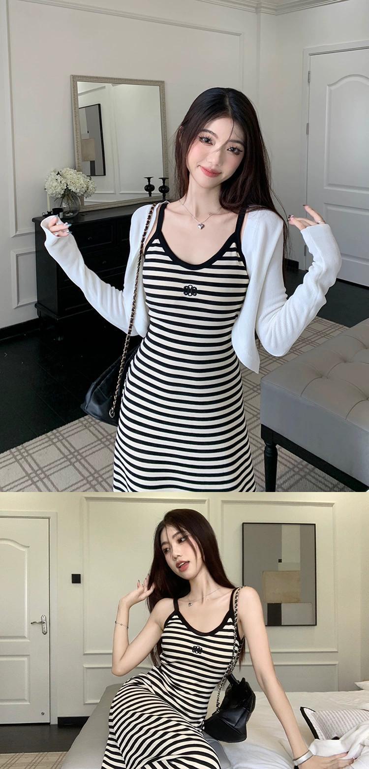 色:ストライプキャミソール,ブラックサスペンダースカート,白いニット日焼け止めカーディガン