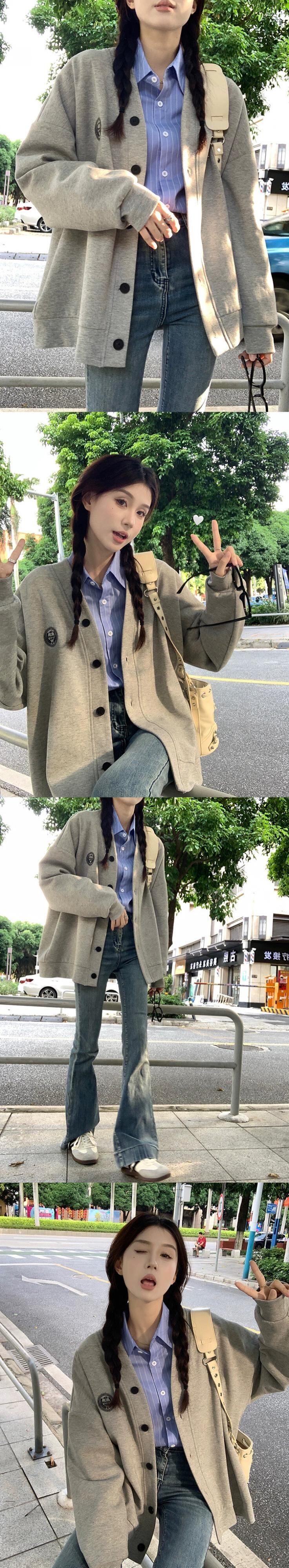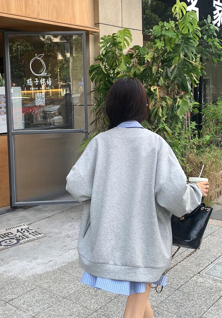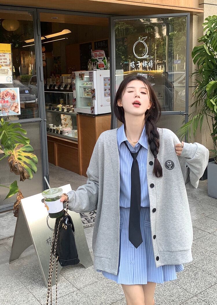色:ブルーストライプのシャツワンピース+ネクタイ,グレーの野球ユニフォームカーディガンスウェットシャツ