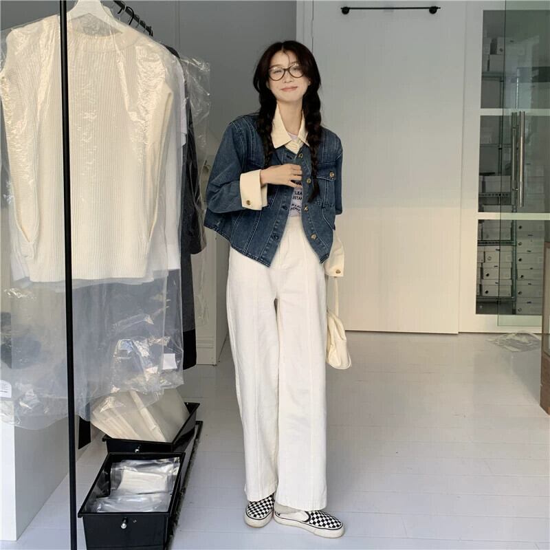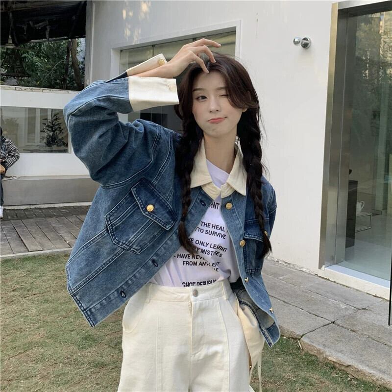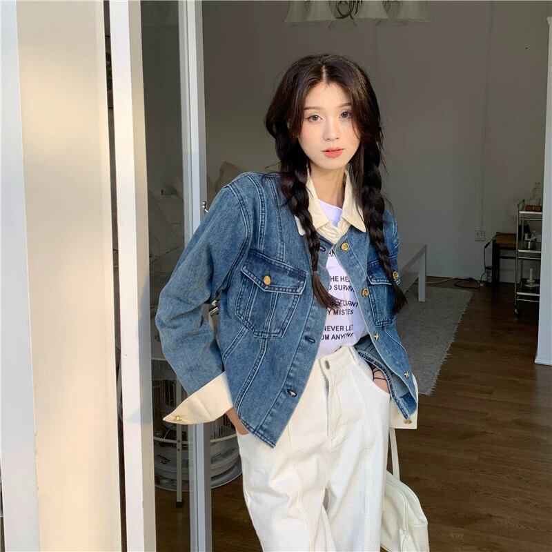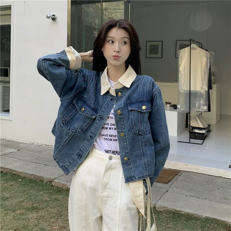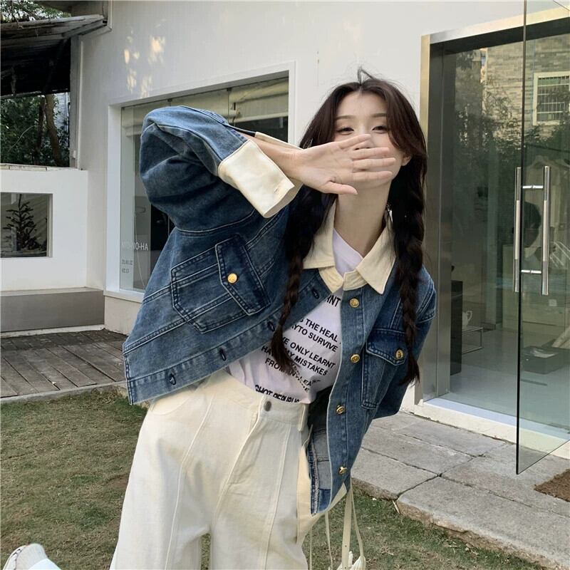 コントラストカラーデニムジャケットの女性 2023 秋の新香港スタイルレトロシックな小男シックなユニークなジャケットトップ オータム 秋物 8571652393018355