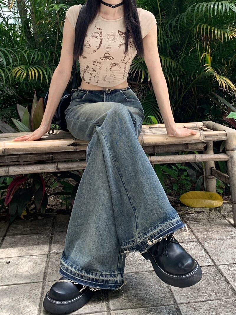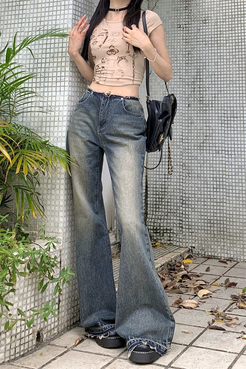 ローエッジ ジーンズ レディース 夏 アメリカン レトロ ネクタイ マイクロ フレア パンツ 2023 新しいハイウエスト スリム フロアレングス パンツ レッド サマー 夏物 8571641173878968