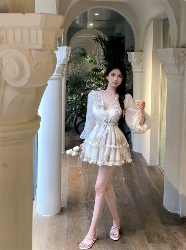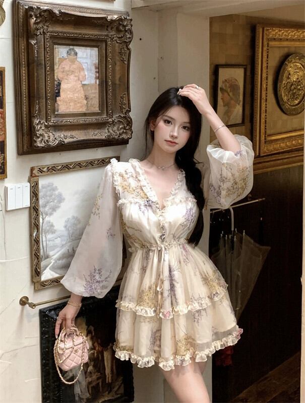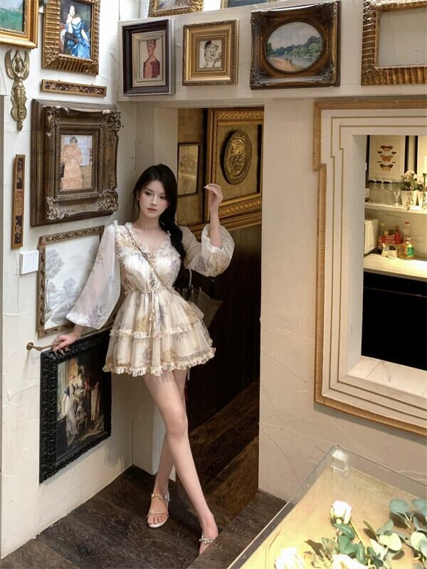 V ネック花柄ドレスの女性の 2023 夏の新しいフランスのレトロな宮殿スタイルのユニークな超素敵なショートスカート レース サマー 夏物 Vネック 8571631668662590