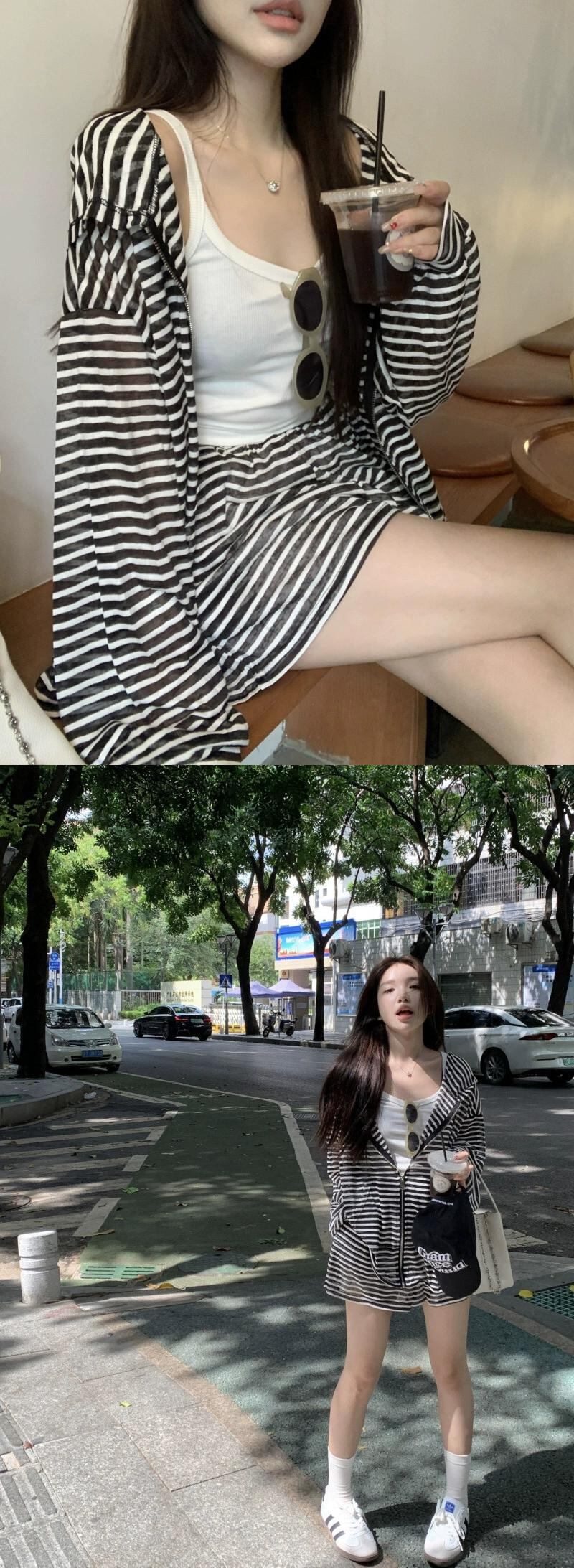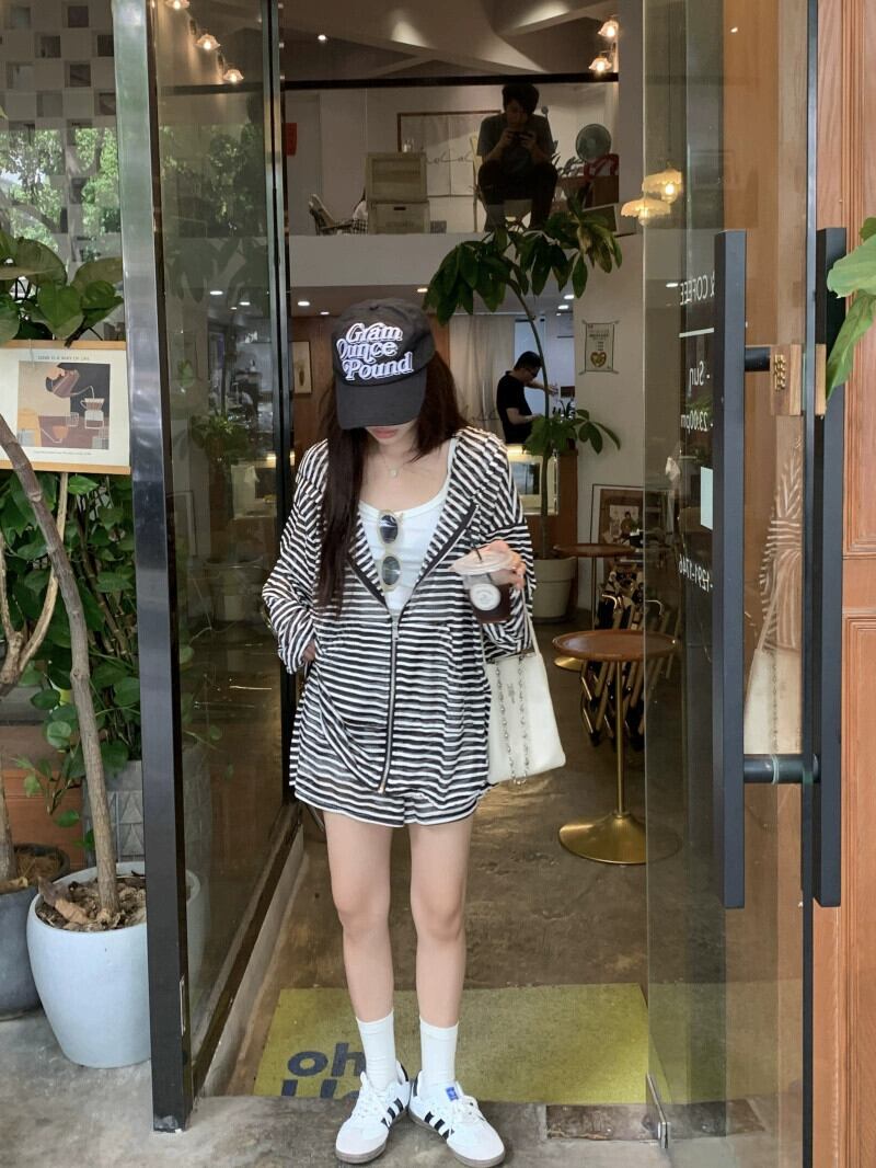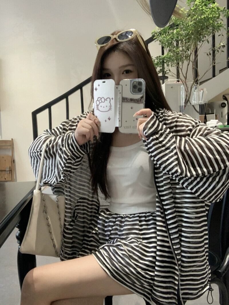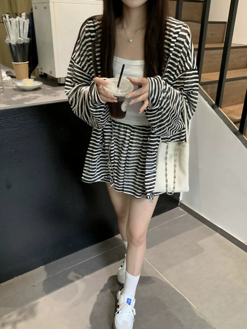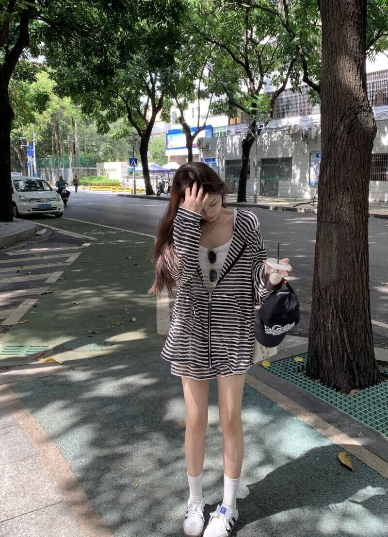 フード付きストライプ日焼け防止カーディガンジャケット女性の夏 2023 ルーズ怠惰なスタイル多用途長袖トップ ロング サマー 夏物 8571639120256588