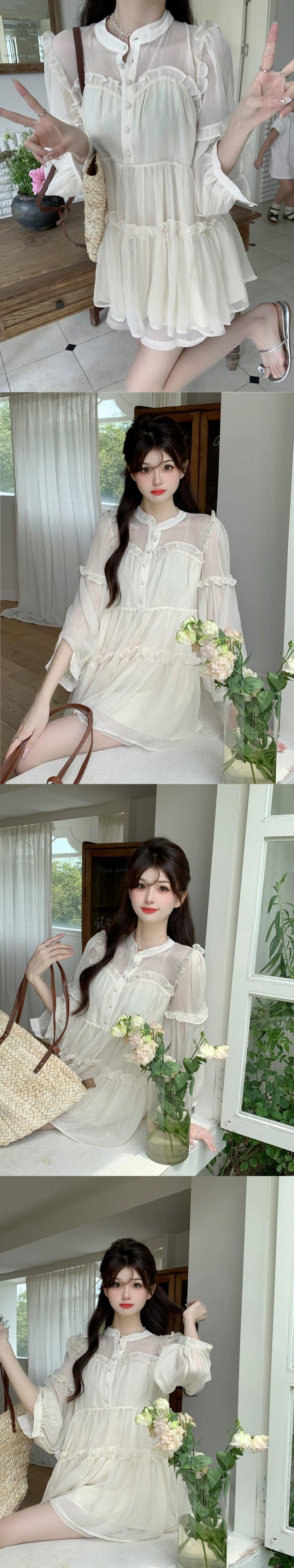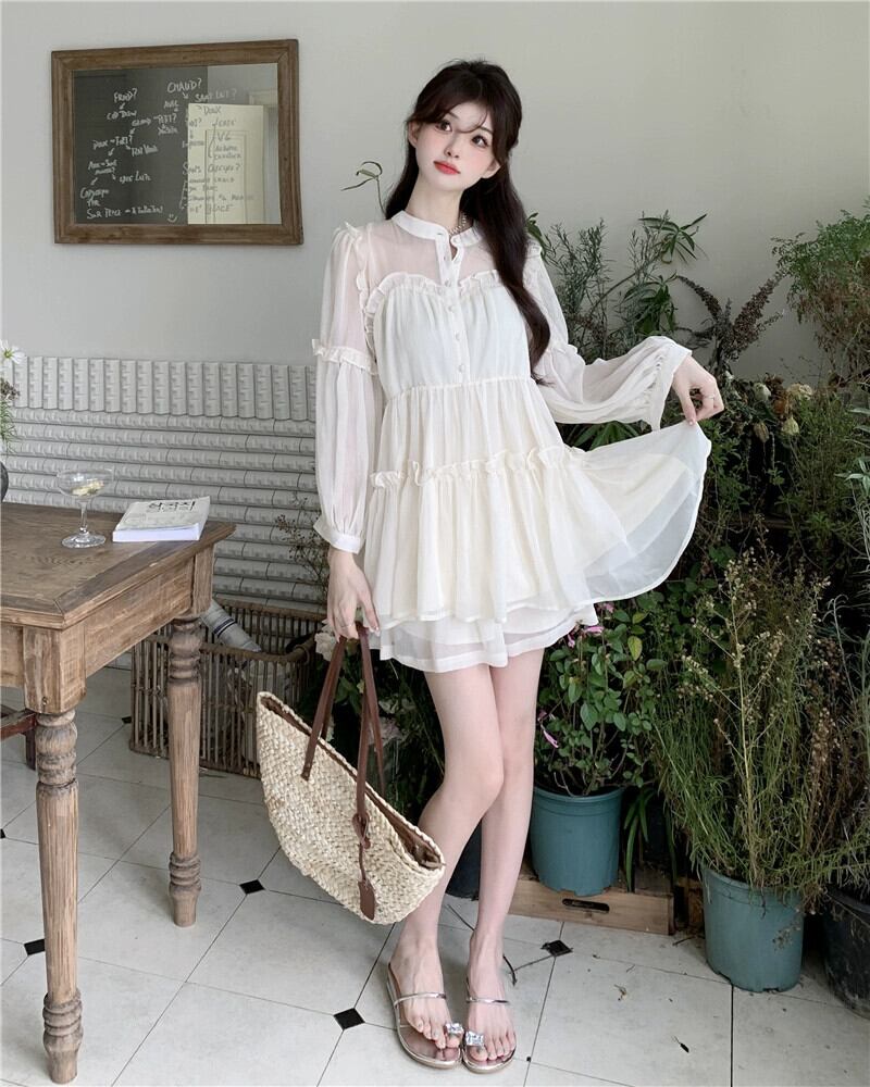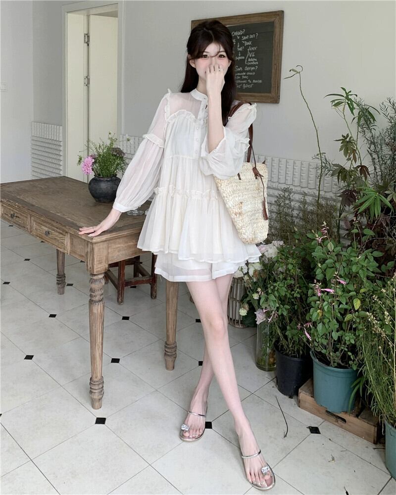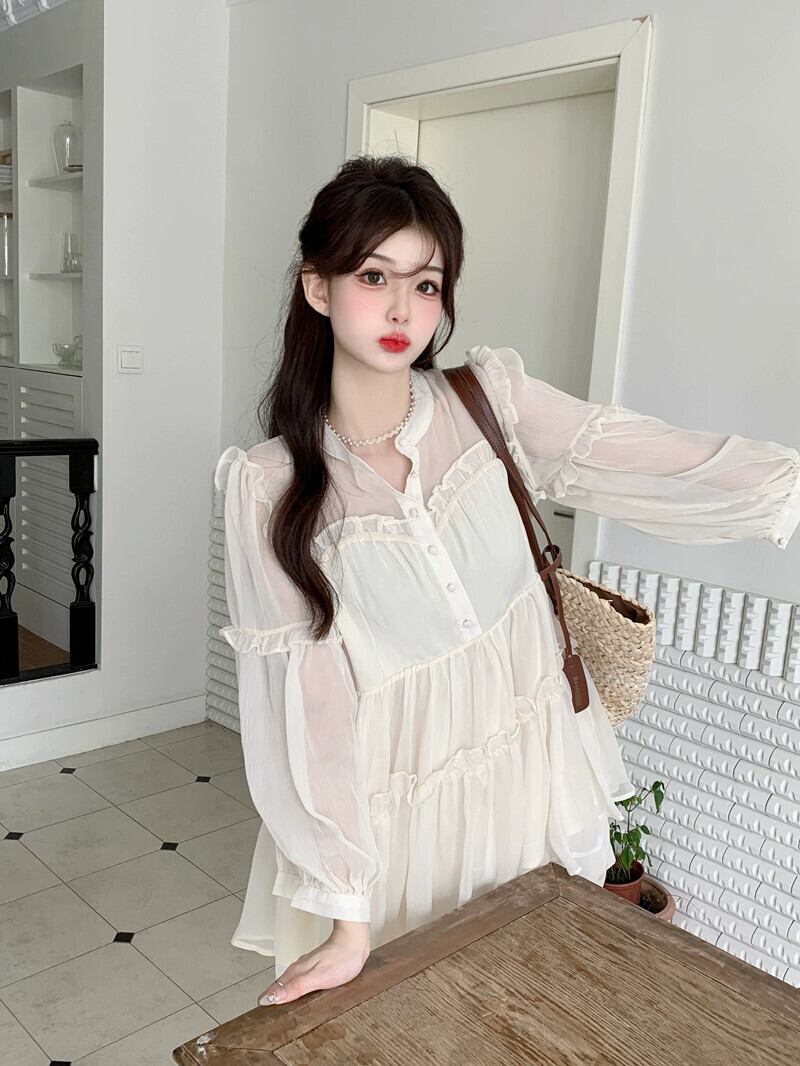2023年夏の新しいフレンチスタイルの菌類エッジのスーパーフェアリートップ女性、甘くてシック、美しくて優しい長袖シャツスーツ ロング 大人ガーリー スウィート キュート カジュアル サマー 夏物 8571649431540041