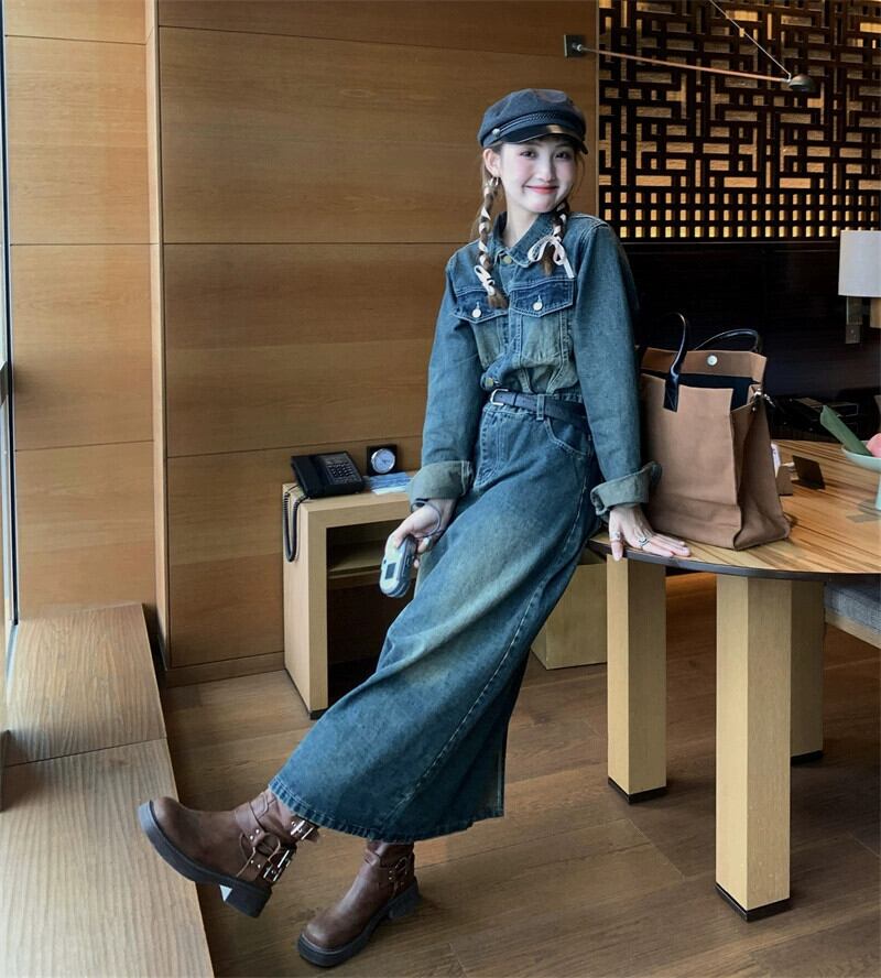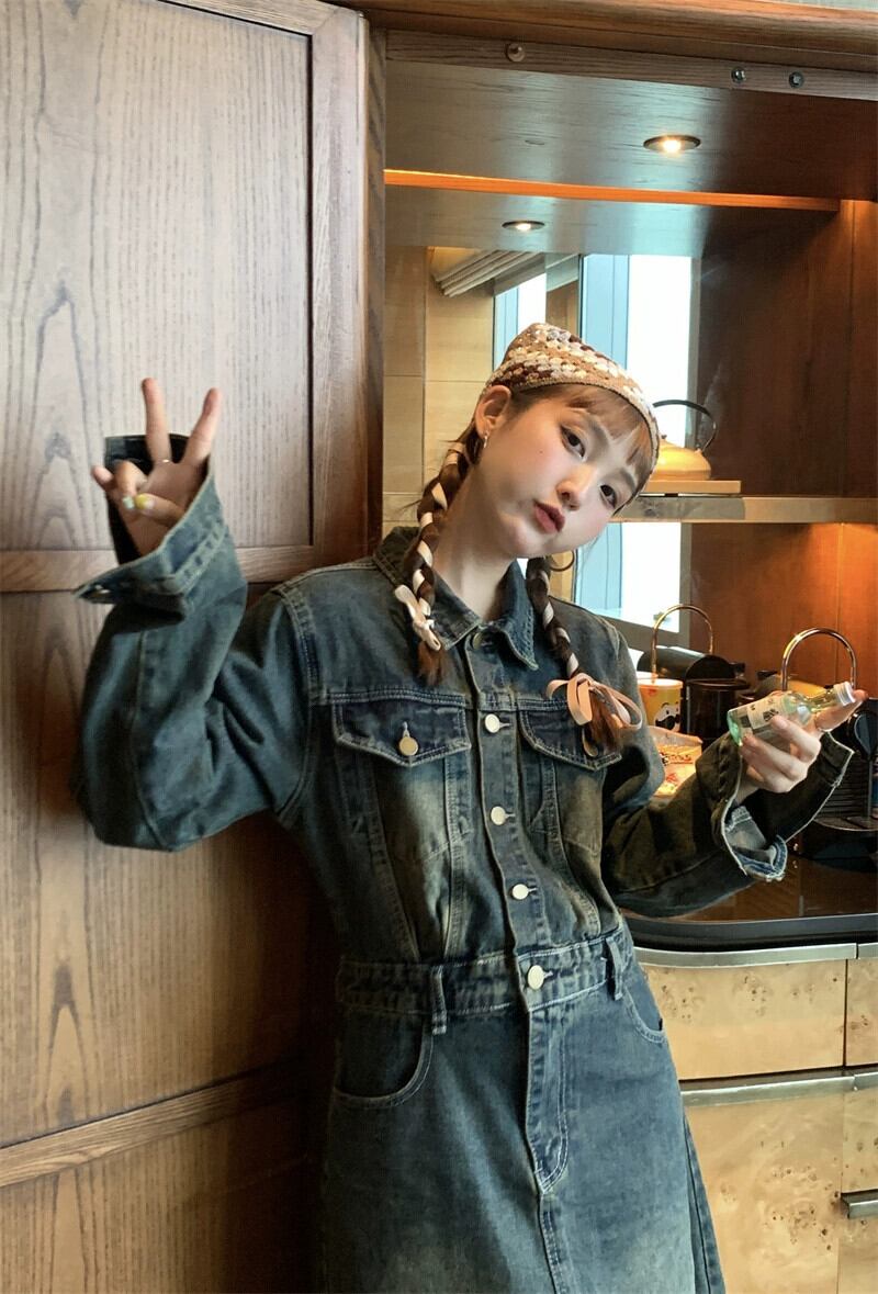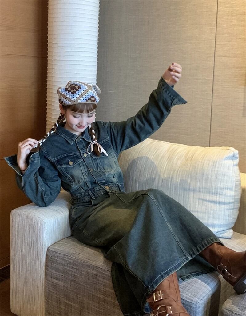 長袖デニムドレスの女性 2023 秋の新香港スタイルのレトロシックな質感のハイエンドウエストロングスカート オータム 秋物 8571615979624027