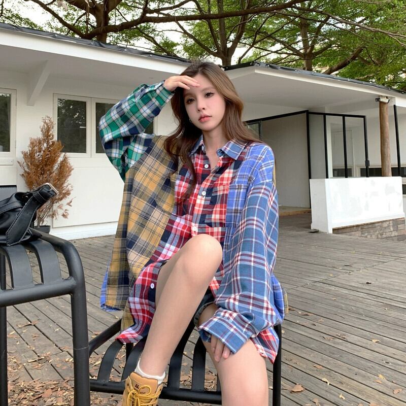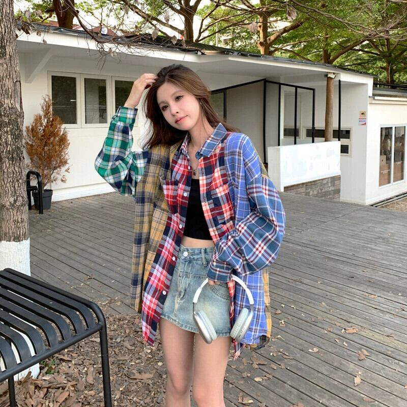 重工業ステッチチェック柄シャツジャケット女性の 2023 初秋長袖シャツレトロ緩い怠惰なスタイルのトップ ロング オータム 秋物 8571647308719576